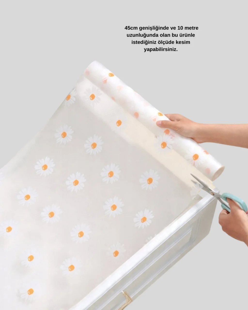 Bu 10 metre papatya desenli kaymaz çekmece matı, yüzeyleri korurken düzeni de sağlar. Uzun yapısı sayesinde geniş çekmecelerde tek parça halinde kullanılabilir.Kaydırmaz özelliği, eşyaların güvenle saklanmasını sağlar. Yapışkan kalıntı bırakmaz. Kolay temizlenebilir olması hijyenik kullanım sunar. Papatya desenleri ile estetik bir görünüm sağlar.