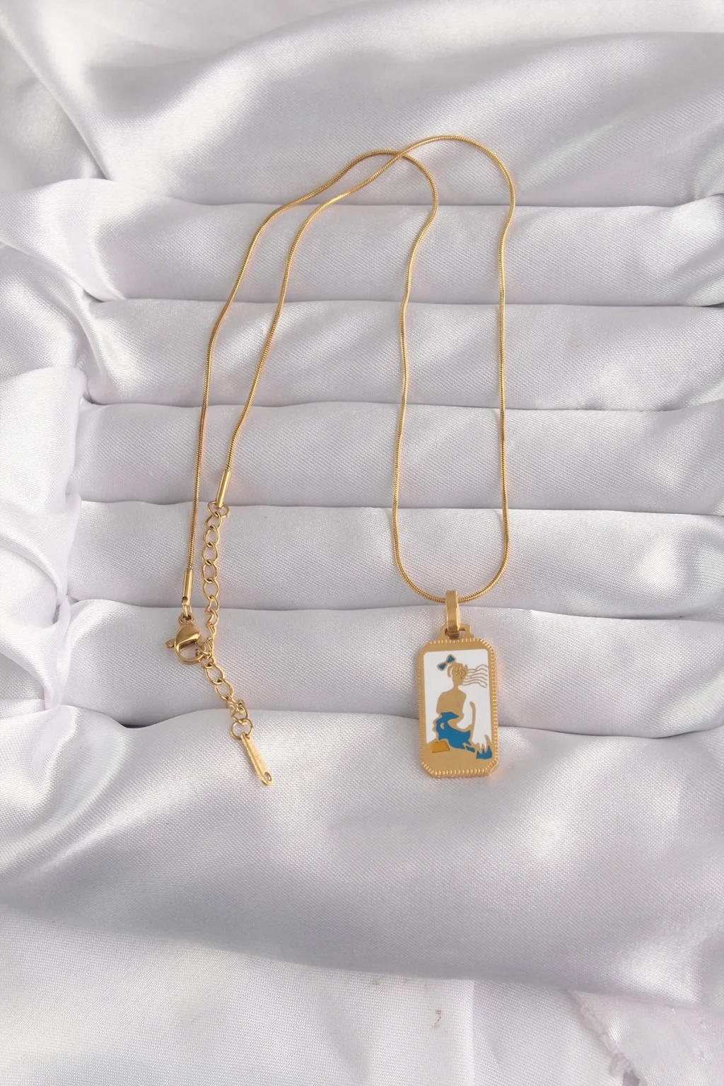316L Çelik Gold Renk Beyaz Mineli Kız Figür Tarot Kolye