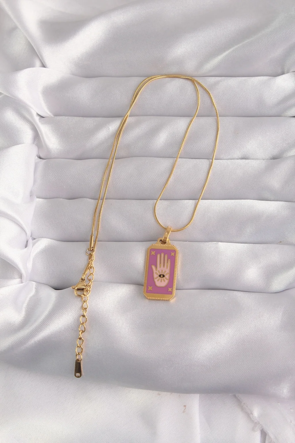 316L Çelik Gold Renk Mor Mineli El Figür Tarot Kolye