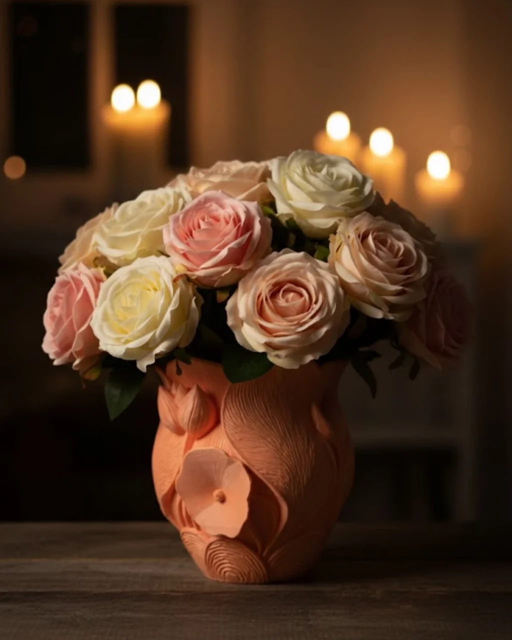3D Kabartmalı Çiçek Motifli Turuncu Dekoratif Vazo