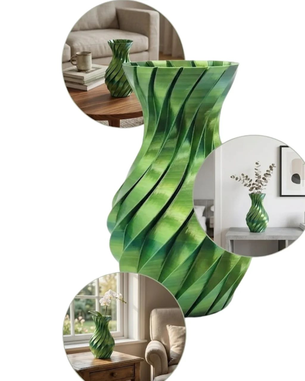 Yaşam alanlarınıza modern bir dokunuş katmak istiyorsanız, yeşil spiral 3D vazo tam aradığınız parça. Özgün tasarımı ve dikkat çekici spiral formu sayesinde bulunduğu ortamda fark yaratır. Canlı yeşil rengi doğadan ilham alarak mekâna enerji ve ferahlık katar.Estetik görünümünün yanı sıra kullanışlı yapısı ile de öne çıkar. Hafif ve sağlam yapısı sayesinde farklı alanlarda rahatlıkla kullanılabilir. Salon sehpası, TV ünitesi, raf veya masa üzerinde dekoratif obje olarak konumlandırılabilir.Modern, minimal ve çağdaş dekorasyon tarzlarıyla uyum sağlayan bu vazo, hem günlük kullanım hem de özel dekorasyon düzenlemeleri için idealdir. Şık ve zarif tasarımı ile evinize değer katar.