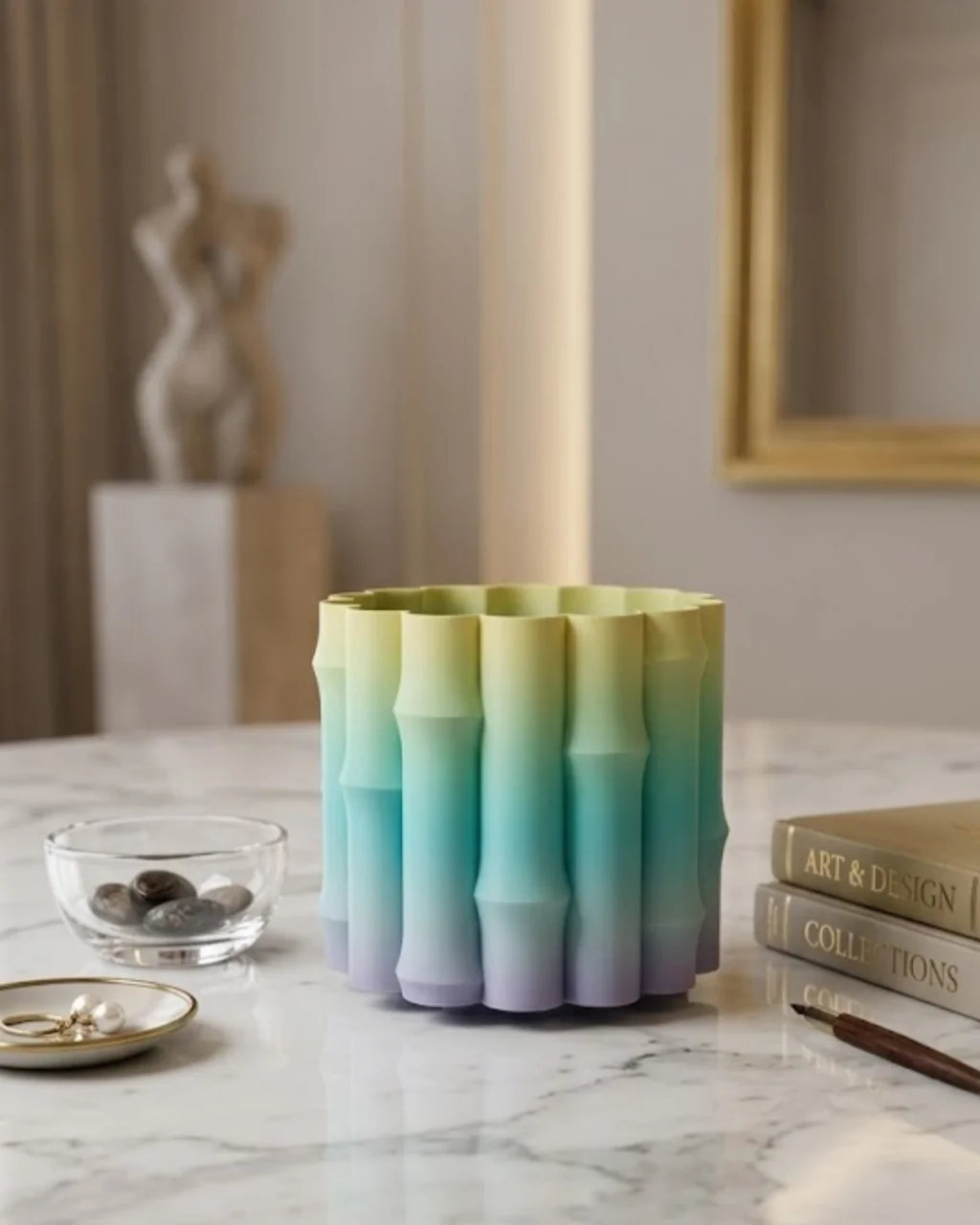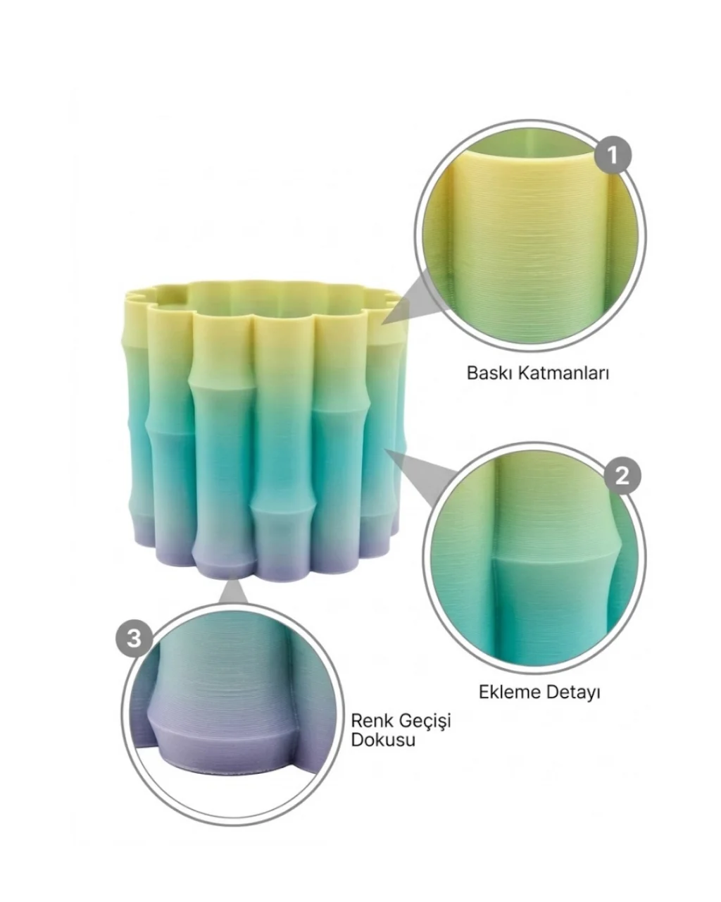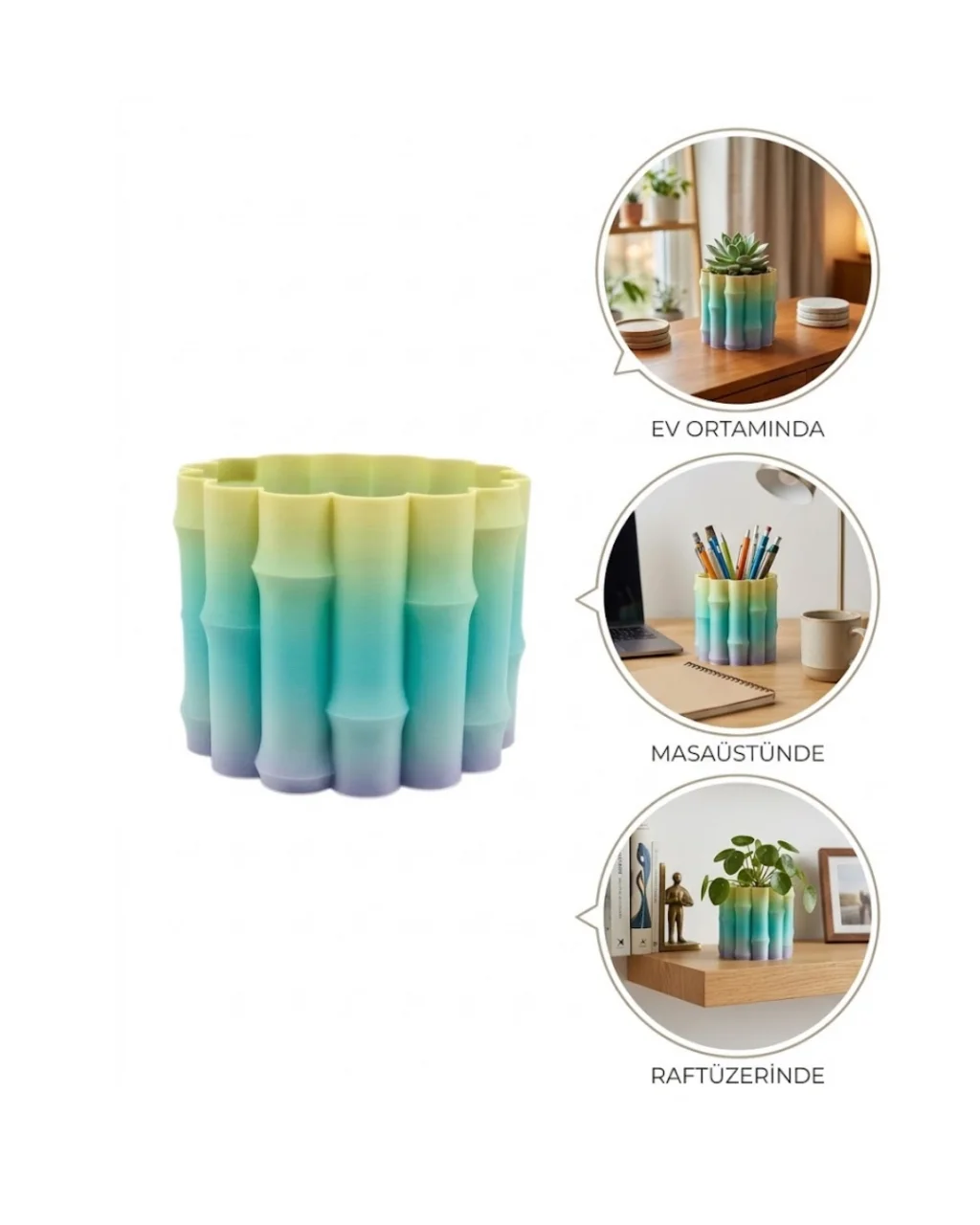 Estetik ve fonksiyonelliği bir araya getiren bu yeşil dekoratif vazo, modern yaşam alanlarında fark yaratmak isteyenler için tasarlanmıştır. Yumuşak renk geçişleri ve dikkat çekici yüzey formu sayesinde bulunduğu ortamda güçlü bir görsel etki oluşturur. Minimal tasarım anlayışı ile sade ama şık bir dekoratif obje olarak öne çıkar.Ürünün yüzeyinde yer alan özel form detayları, ışığın farklı açılarda yansımasını sağlayarak ürüne hareket kazandırır. Açık yeşilden daha koyu tonlara doğru geçiş yapan renk yapısı, ortama doğal ve huzurlu bir atmosfer katar. Bu özellik, ürünü hem dekoratif hem de estetik açıdan değerli bir parça haline getirir.Salon, ofis, yatak odası veya çalışma alanlarında rahatlıkla kullanılabilir. Raf, sehpa veya masa üstü gibi farklı alanlarda konumlandırılabilir. İçine yerleştirilecek çiçekler ile daha canlı bir görünüm elde edilebilir veya sade haliyle minimalist bir dekor oluşturulabilir.Hafif ve sağlam yapısı sayesinde uzun süreli kullanım sunar. Taşınabilir olması sayesinde farklı alanlarda rahatlıkla kullanılabilir. Modern tasarımı ile hem günlük kullanım hem de hediye alternatifi olarak tercih edilebilir.Bulunduğu ortama ferahlık ve zarafet katan bu dekoratif vazo, sade ama etkili bir dekorasyon arayanlar için mükemmel bir seçimdir.