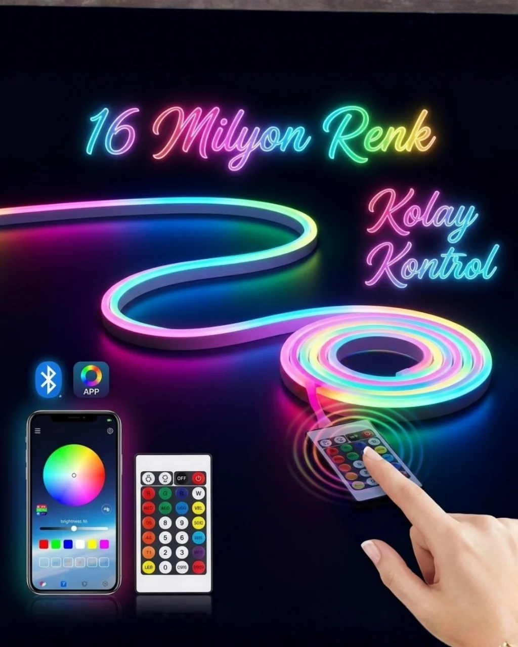 3 metre RGB akıllı neon LED şerit ışık, modern dekoratif aydınlatma çözümleri arasında öne çıkan pratik ve estetik bir üründür. Esnek neon LED yapısı sayesinde farklı yüzeylere kolayca uygulanabilir ve bulunduğu ortama modern bir atmosfer kazandırır. Özellikle televizyon arkası ambiyans ışığı, masa arkası aydınlatma, raf dekorasyonu ve oyun odası ışıklandırması gibi alanlarda oldukça popüler bir kullanım sunar.RGB LED teknolojisi sayesinde bu ürün geniş bir renk seçeneği sunar. Kullanıcılar farklı renk modlarını seçerek ortamın atmosferini istedikleri gibi değiştirebilir. Renk geçiş efektleri sayesinde ışıklar akıcı bir şekilde değişir ve ortama estetik bir görünüm kazandırır.Uzaktan kumanda kontrolü sayesinde kullanıcılar LED ışıkları pratik bir şekilde kontrol edebilir. Kumanda üzerinden renk değiştirme, parlaklık ayarı ve farklı ışık modlarını seçmek oldukça kolaydır. Ayrıca mobil uygulama kontrolü sayesinde telefon üzerinden daha detaylı ışık ayarları yapılabilir.USB bağlantı özelliği sayesinde LED şerit ışık farklı güç kaynaklarıyla çalışabilir. Bilgisayar USB portu, adaptör veya powerbank üzerinden enerji alabilir. Bu özellik ürünün taşınabilir kullanım avantajı sunmasını sağlar.Esnek neon LED tasarımı sayesinde ürün farklı şekillerde kullanılabilir ve dekoratif aydınlatma tasarımları oluşturmak için ideal bir yapıya sahiptir. Duvar kenarlarına, masa arkasına veya raf altına kolayca uygulanabilir. Suya dayanıklı yapısı sayesinde hem iç mekan hem de dış mekan kullanımına uygun bir yapı sunar.RGB akıllı neon LED şerit ışık, modern tasarımı, kolay kurulumu ve geniş renk seçenekleri sayesinde yaşam alanlarını daha estetik ve keyifli hale getiren dekoratif bir aydınlatma ürünüdür.