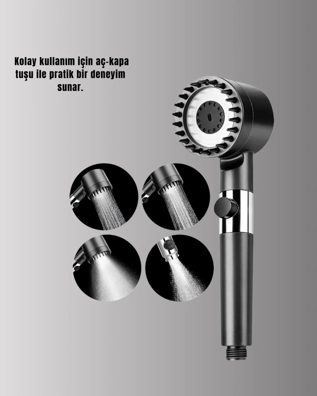 Aç kapa tuşlu filtreli duş başlığı, kullanım kolaylığı ve yenilikçi tasarımıyla banyo deneyimini üst seviyeye taşır. Tek tuşla suyu durdurma ve yeniden başlatma imkânı sunan yapısı, pratik bir kullanım sağlar. Bu özellik, özellikle saç bakım ürünleri kullanırken ya da duş sırasında ara vermek gerektiğinde büyük rahatlık sunar.Masaj fonksiyonu sayesinde duş sırasında rahatlatıcı bir etki elde edilir. Su akışı, vücudu nazikçe uyaran bir basınçla dağıtılır. Bu sayede kaslar gevşer ve duş sonrası daha dinlenmiş bir his oluşur.Filtre sistemi, suyun daha temiz hissedilmesine yardımcı olur. Kireç ve tortu gibi istenmeyen maddelerin bir kısmını süzerek su kalitesini artırır. Bu özellik, saç ve cilt bakımına önem veren kullanıcılar için önemli bir avantajdır.Dayanıklı plastik malzemeden üretilmiş olması, ürünü uzun süreli kullanım için ideal hale getirir. Nemli ortamlarda dahi performansını korur. Kolay temizlenebilir yapısı, hijyenik kullanım sunar.Modern tasarımı sayesinde banyonuza estetik bir katkı sağlar. Çok fonksiyonlu yapısı ile hem konfor hem de görsellik arayanlar için uygun bir seçimdir.