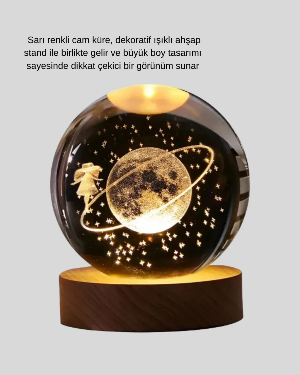 Bu ışıklı dekoratif cam küre, sarı ışığın sıcak tonlarıyla evinize huzurlu bir atmosfer katarken kız figürü tasarımıyla da dekorasyona eğlenceli bir dokunuş getirir. Büyük boy yapısı sayesinde tek başına bile güçlü bir dekoratif etki oluşturur. Ahşap standı ile sabit ve sağlam durur, istenilen yere kolayca taşınabilir. Yatak odası, salon, ofis ve çalışma alanlarında kullanılmaya uygun estetik ve modern bir dekoratif üründür.