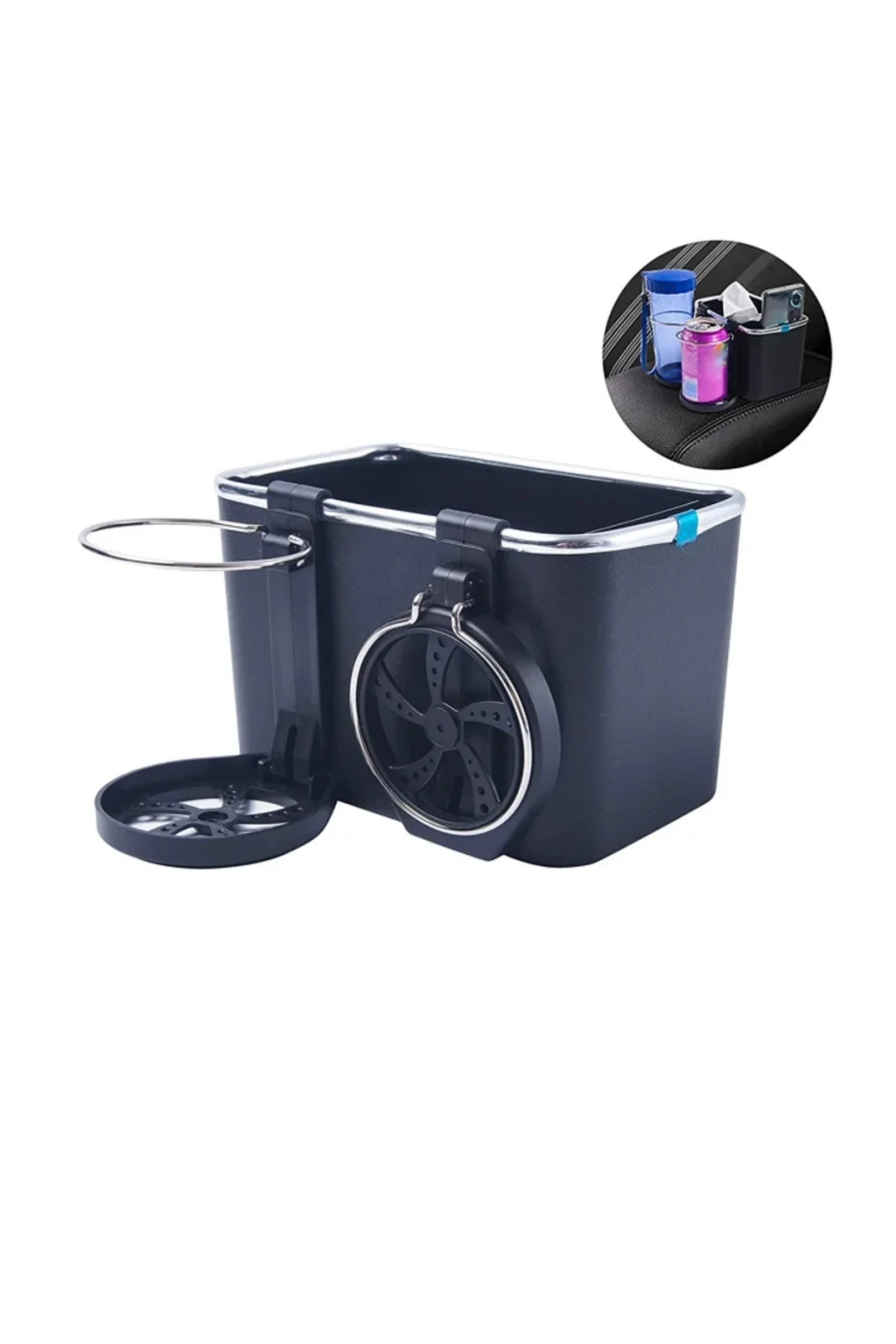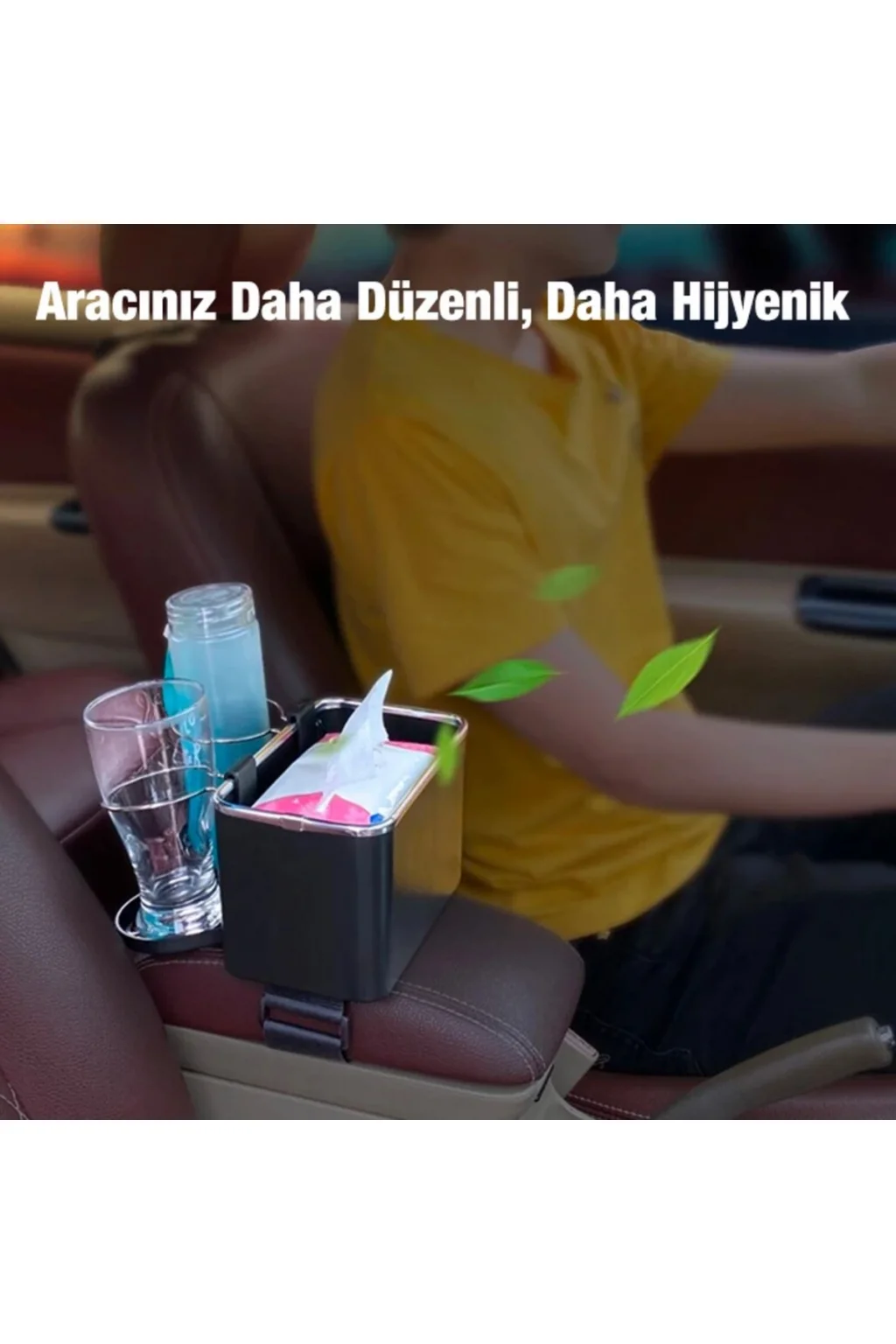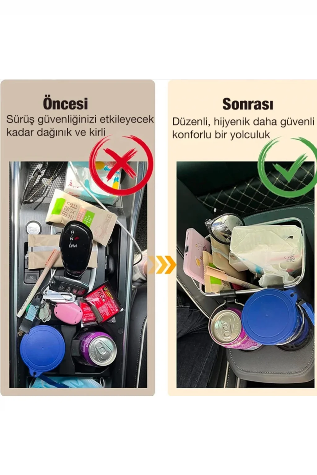 Atıştırmalıklarınızı, kağıt mendilleri, kişisel eşyalarınızı koyabileceğiniz organizatör aynı zamanda içecekleriniz için de stand görevi görür.