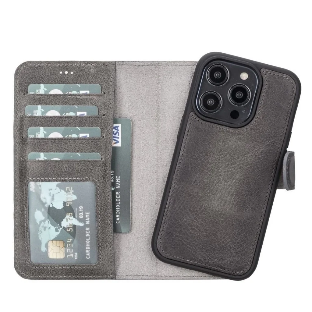 Apple iPhone 14 Pro Uyumlu Deri Cüzdanlı Kılıf MWWN VS4EF Gri