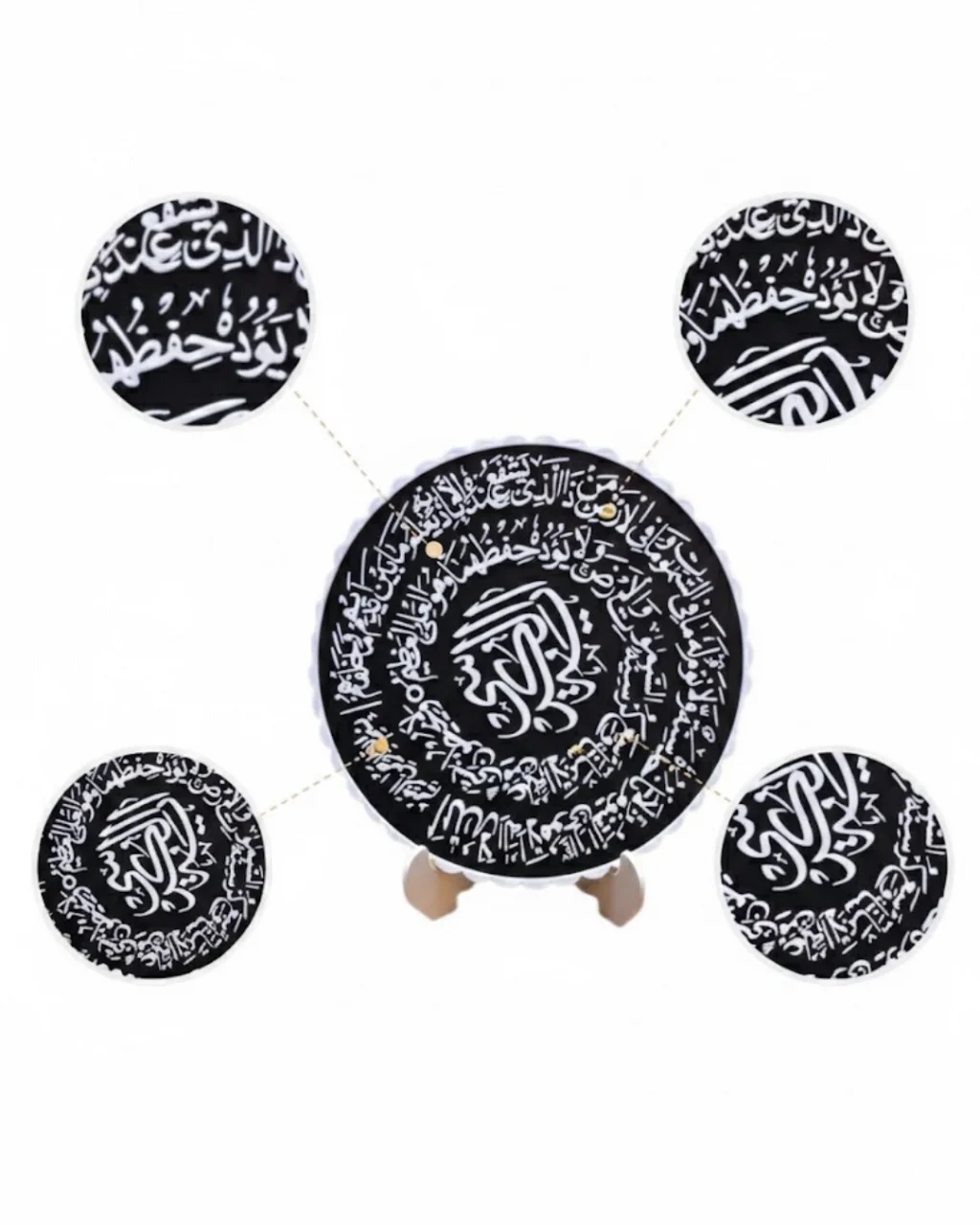 Bu Ayetel Kürsi dekoratif pano, modern tasarım ile geleneksel hat sanatını bir araya getirir. Siyah zemin üzerine beyaz yazı kontrastı sayesinde dikkat çekici bir görünüm oluşturur. Bulunduğu ortama hem huzur hem de estetik bir şıklık kazandırır.Yuvarlak formu, klasik dikdörtgen tabloların dışında özgün bir tasarım sunar. Çevresini saran detaylı yazı işçiliği, merkezdeki güçlü kompozisyon ile dengeli bir bütünlük oluşturur. Yazı karakterinin netliği ve tasarımın simetrik yapısı, ürünü dekoratif açıdan oldukça güçlü hale getirir.Ev dekorasyonunda salon, antre, çalışma odası veya kitaplık üstünde rahatlıkla konumlandırılabilir. Standlı yapısı sayesinde ekstra montaj gerektirmez. Sade ama etkileyici bir dini dekor ürünü arayanlar için ideal bir tercihtir.Özel günlerde, yeni ev hediyesi olarak veya anlamlı bir hatıra olarak sunulabilecek zarif bir üründür.