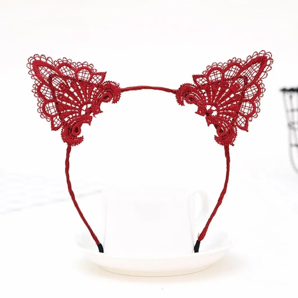 Dantelli Kırmızı Kedi Tacı - Vintage Tarz Dantel Kedi Kulak