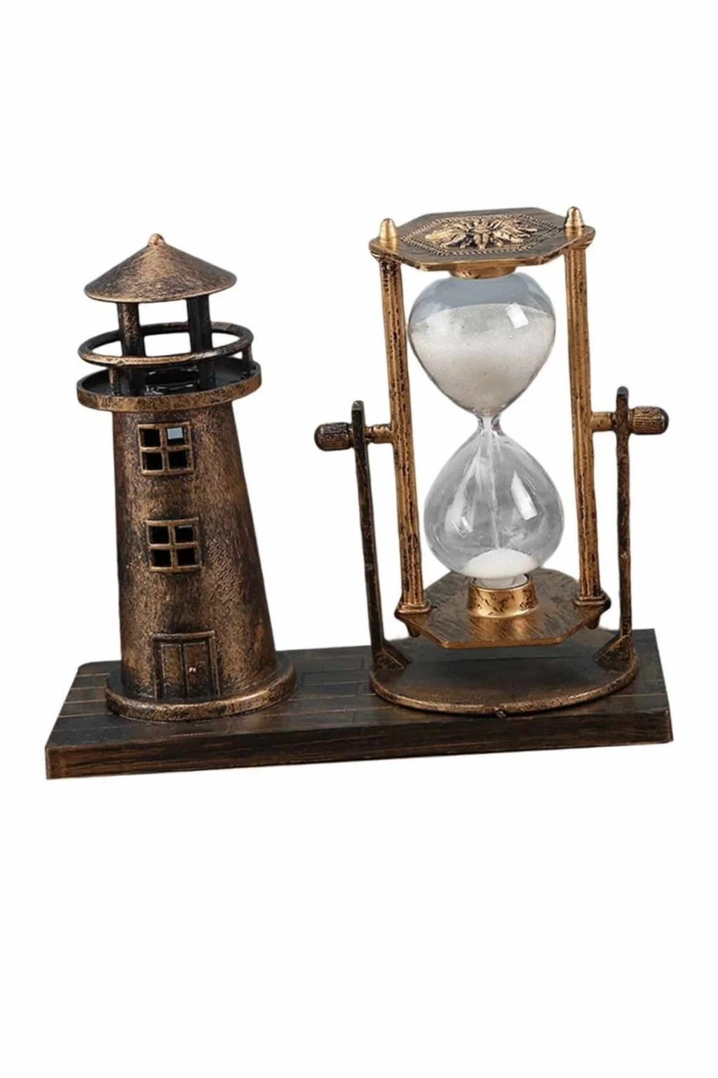 Modern ve Estetik TasarımBu özel kum saati, klasik kum saatlerinin modern bir yorumu olarak tasarlanmıştır. Deniz feneri figürüyle birleşen zarif formu, her tarza uyum sağlayabilecek bir dekorasyon öğesi olmasını sağlıyor. Cam bölmeler içerisindeki ince kum tanecikleri, üst hazneden alt hazneye süzülerek akarken büyüleyici bir görsel şölen sunuyor. Hareketli yapısıyla zamanı ölçmenin geleneksel bir yolunu hatırlatırken, aynı zamanda ortamın atmosferine sofistike bir dokunuş katıyor. Ofislerde masa üstünde veya çalışma odalarında huzurlu bir atmosfer yaratmak için ideal bir seçimdir.