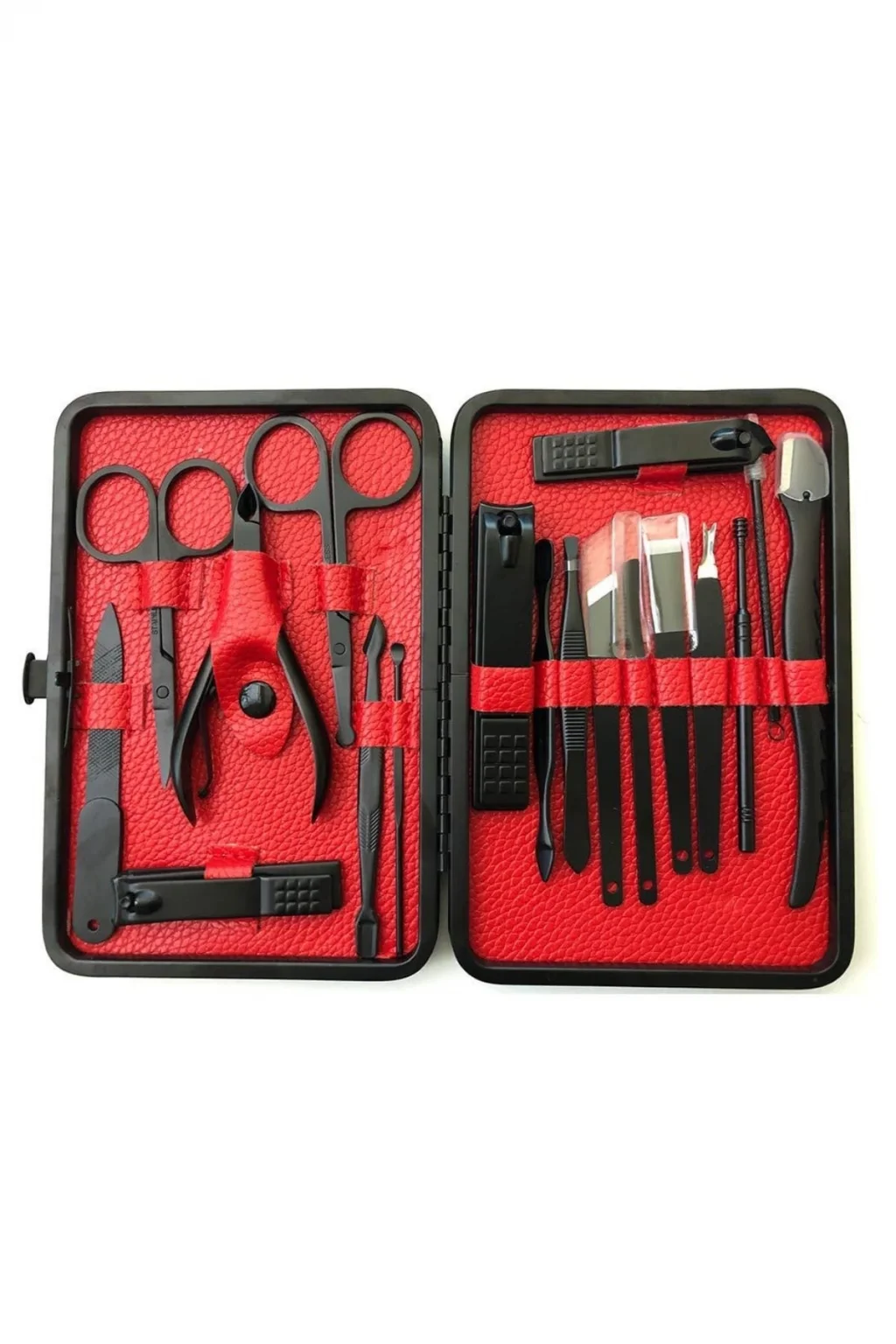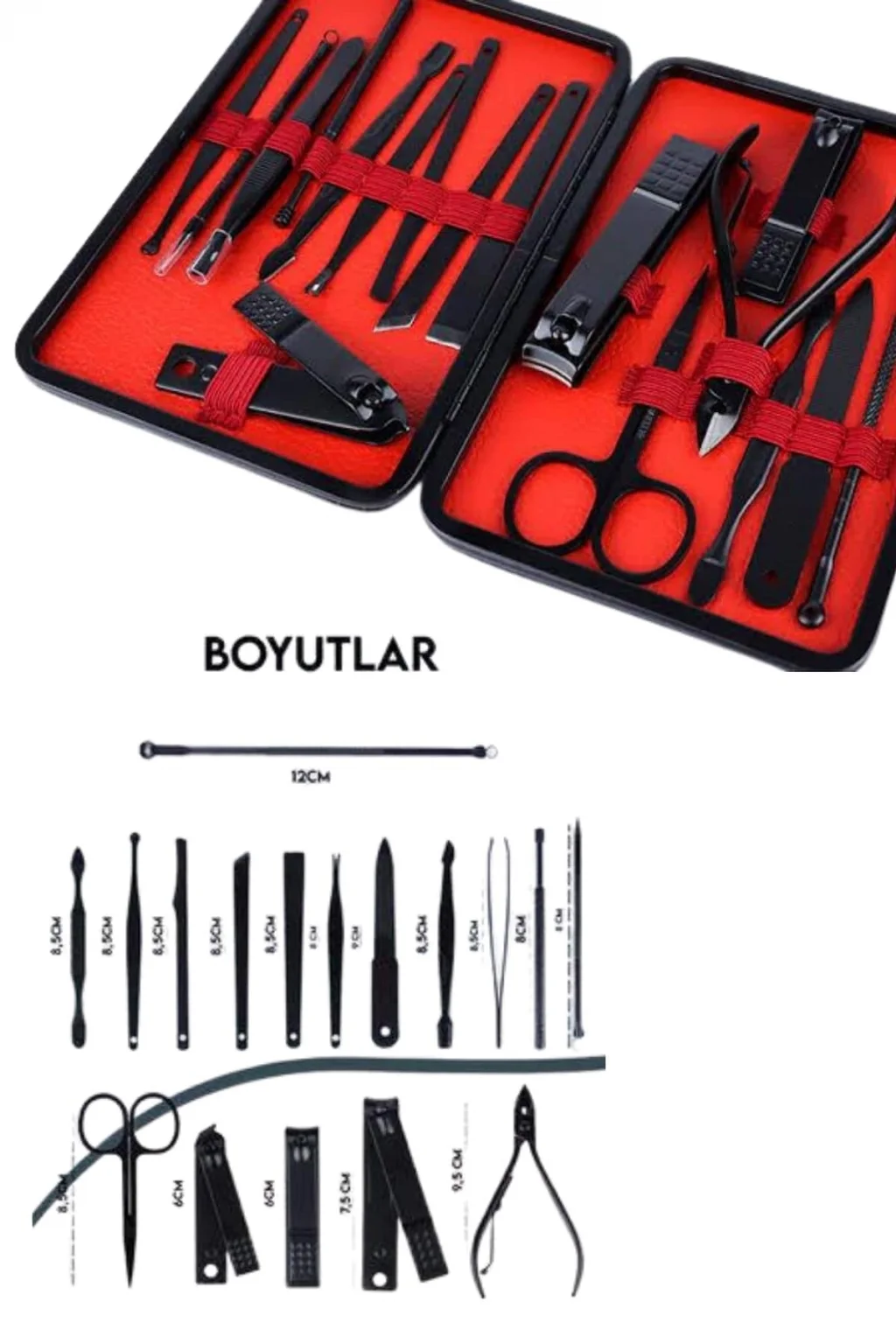 17 Parça Manikür Pedikür Seti Paslanmaz Çelik Deri Çantalı Siyah Tırnak Bakım SetiBu 17 parçalı manikür pedikür seti, el ve ayak bakımınızı en iyi şekilde yapabilmeniz için gerekli tüm araçları içerir. Setin tamamı yüksek kaliteli paslanmaz çelikten üretilmiştir, bu sayede uzun ömürlü, dayanıklı ve hijyeniktir. Setin her bir parçası, bakımınızı kolaylaştırmak ve profesyonel sonuçlar elde etmenize yardımcı olmak için titizlikle seçilmiştir.Yüksek Kaliteli Paslanmaz Çelik ve Keskin Aletler:Setin tüm ürün parçaları %100 paslanmaz çelikten üretilmiştir. Bu, korozyon riski olmadan uzun süre kullanılmasını sağlar. Keskin aletler, tırnak bakımında mükemmel sonuçlar elde etmenize yardımcı olur. Hem el hem de ayak tırnaklarınıza güvenle şekil verebilir, temiz ve düzgün kesimler yapabilirsiniz.Şık ve Fonksiyonel Deri Çanta:Set, taşınabilirliği artıran zarif bir deri çanta içinde sunulur. Fermuarla kolayca açılıp kapanabilen bu çanta, tüm aletlerinizi düzenli tutarak, taşımayı kolaylaştırır. Çantanızda rahatça taşıyabileceğiniz bu set, seyahatte veya evde kullanım için mükemmeldir.Kapsamlı ve Fonksiyonel Set İçeriği:Bu set, tırnak bakımınızı mükemmel bir şekilde yapabilmeniz için ihtiyacınız olan tüm aletleri içerir. İçeriğinde büyük ve küçük tırnak makasları, sivri uçlu tırnak makası, törpü, et ittirici, pedikür bıçakları ve daha birçok kullanışlı araç bulunur. Ayrıca, her parça hijyenik kullanım için kolayca temizlenebilir.Sağlıklı ve Güvenli Kullanım:Paslanmaz çelik yapısı, korozyona karşı dayanıklı olup, bakım sırasında enfeksiyon riskini en aza indirir. Her bir parça, sağlıklı ve güvenli bir kullanım için tasarlanmıştır, bu da hijyenin her zaman ön planda tutulmasını sağlar.Paket İçeriği:1 adet büyük tırnak makası1 adet küçük tırnak makası1 adet sivri uçlu tırnak makası1 adet çift uçlu komedon1 adet törpü1 adet et ittirici1 adet çift taraflı tırnak kaldırma aleti1 adet makas1 adet pedikür bıçağı1 adet çarpraz pedikür bıçağı1 adet kavisli pedikür bıçağı1 adet V şeklinde et itme1 adet itme çubuğu1 adet tırnak temizleme1 adet cımbız1 adet iğneli komedon1 adet kulak temizlemeÖzellikler:%100 paslanmaz çelik malzemeŞık ve taşıması kolay deri çantaHijyenik ve güvenli kullanımKolay temizlenebilir aletlerSeyahat dostu, taşınabilir yapıEvde veya seyahatte kullanabileceğiniz bu manikür pedikür seti, bakımınızı en iyi şekilde yapabilmeniz için ideal bir seçimdir. Hem kendinize hem de sevdiklerinize hediye edebileceğiniz harika bir bakım setidir.