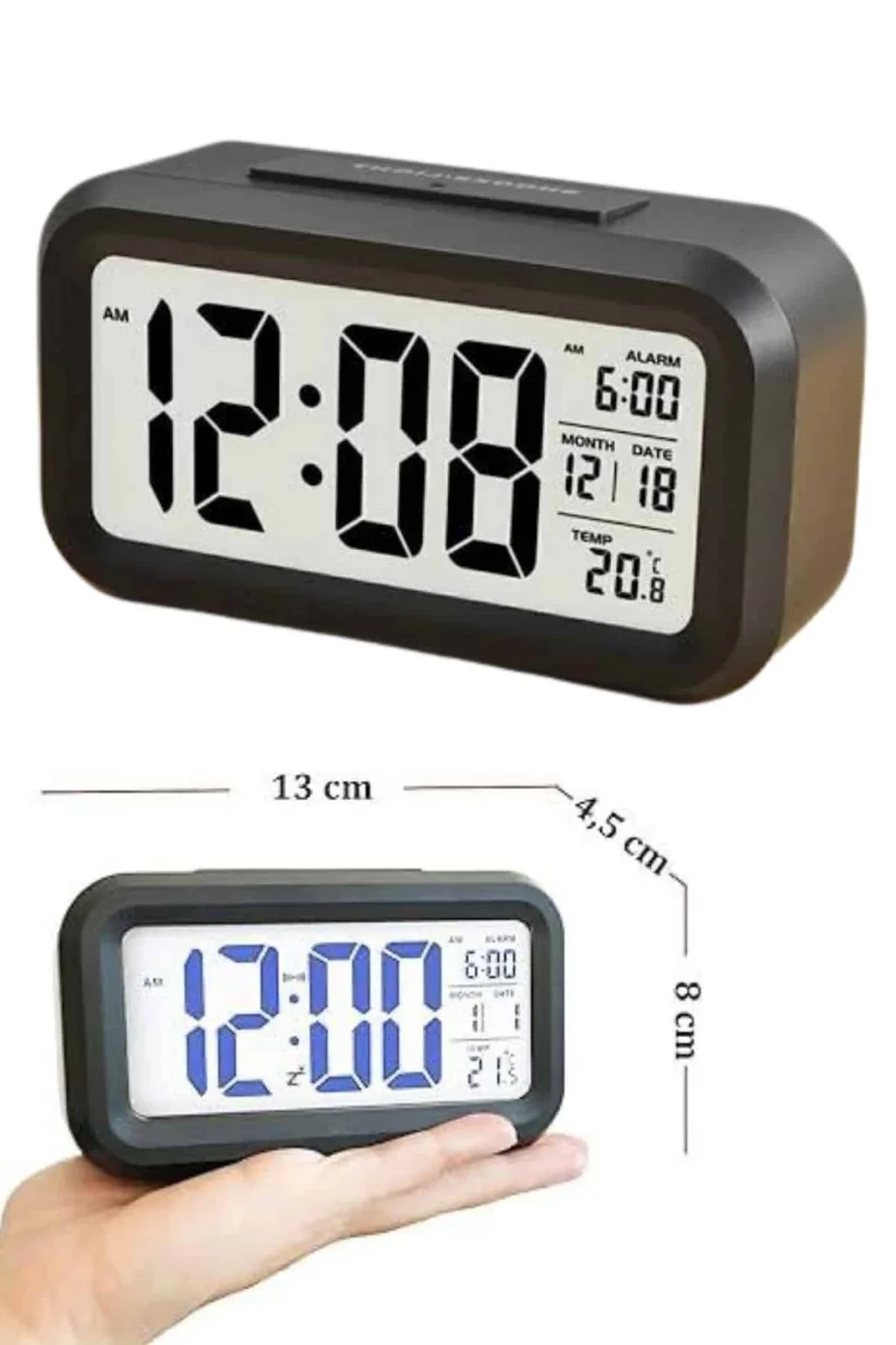 Pratik kullanımı ve şık tasarımıyla öne çıkan bu dijital masa saati, her anı planlamanıza yardımcı olmak için ideal bir çözümdür. Büyük LCD ekranı sayesinde saati, tarihi ve sıcaklık bilgilerini rahatlıkla takip edebilirsiniz. Kararmış ortamlarda dahi ekranın otomatik olarak aydınlanması, saatin her koşulda net bir şekilde görünmesini sağlar. 6 saniye sonra kendiliğinden sönen ışık özelliği, gözlerinizi rahatsız etmeden enerji tasarrufu sağlar.Alarm fonksiyonu sayesinde sabahları rahatça uyanabilir, güne dinç başlayabilirsiniz. Ayrıca, tarih ve ortam sıcaklığı bilgilerini aynı anda görüntüleyebilmeniz, günlük planlamanızı kolaylaştırır. Kompakt ve şık tasarımı, ofis veya ev ortamında rahatlıkla kullanılmasını sağlar.Ürün ölçüleri 4,3 x 15,1 x 7,7 cm olup, 3 adet AA pil ile çalışır (piller dahil değildir). Paket içeriğinde bir adet dijital masa saati bulunmaktadır. Hem estetik hem de fonksiyonel özellikleri ile hayatınıza pratiklik katacak bu saat, günlük kullanım için mükemmel bir tercihtir.