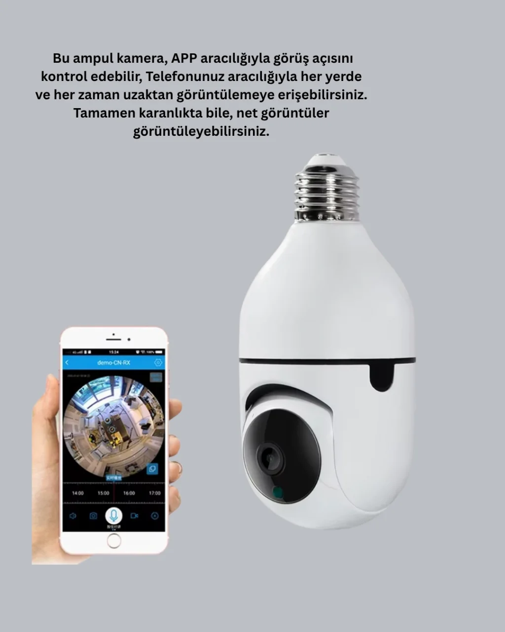 E27 ampul duyuna uyumlu olan bu güvenlik kamerası, kullanıcı dostu bir kurulum süreci sunar. Karmaşık montaj süreçlerine gerek kalmadan doğrudan kullanılabilir.360 derece dönebilen lens yapısı sayesinde daha geniş alanlar izlenebilir. Kamera, 1080P çözünürlüğünde video kaydı yapar ve bu görüntüler yüksek netlikte izlenebilir.Gece görüş özelliği ile donatılmış cihaz, karanlık ortamlarda da verimli çalışır. Bu, dış ortamlar ve ışıklandırmanın yetersiz olduğu bölgeler için önemli bir avantajdır.Hareket algılama özelliği sayesinde yalnızca gerekli anlar kayıt altına alınır. Bu da hem depolama tasarrufu sağlar hem de daha etkili güvenlik takibi sunar.Cihaz yerel kayıt yapabilme kapasitesine sahiptir. Bu da görüntülerin yalnızca internet bağlantısına bağımlı olmadan saklanabileceği anlamına gelir.