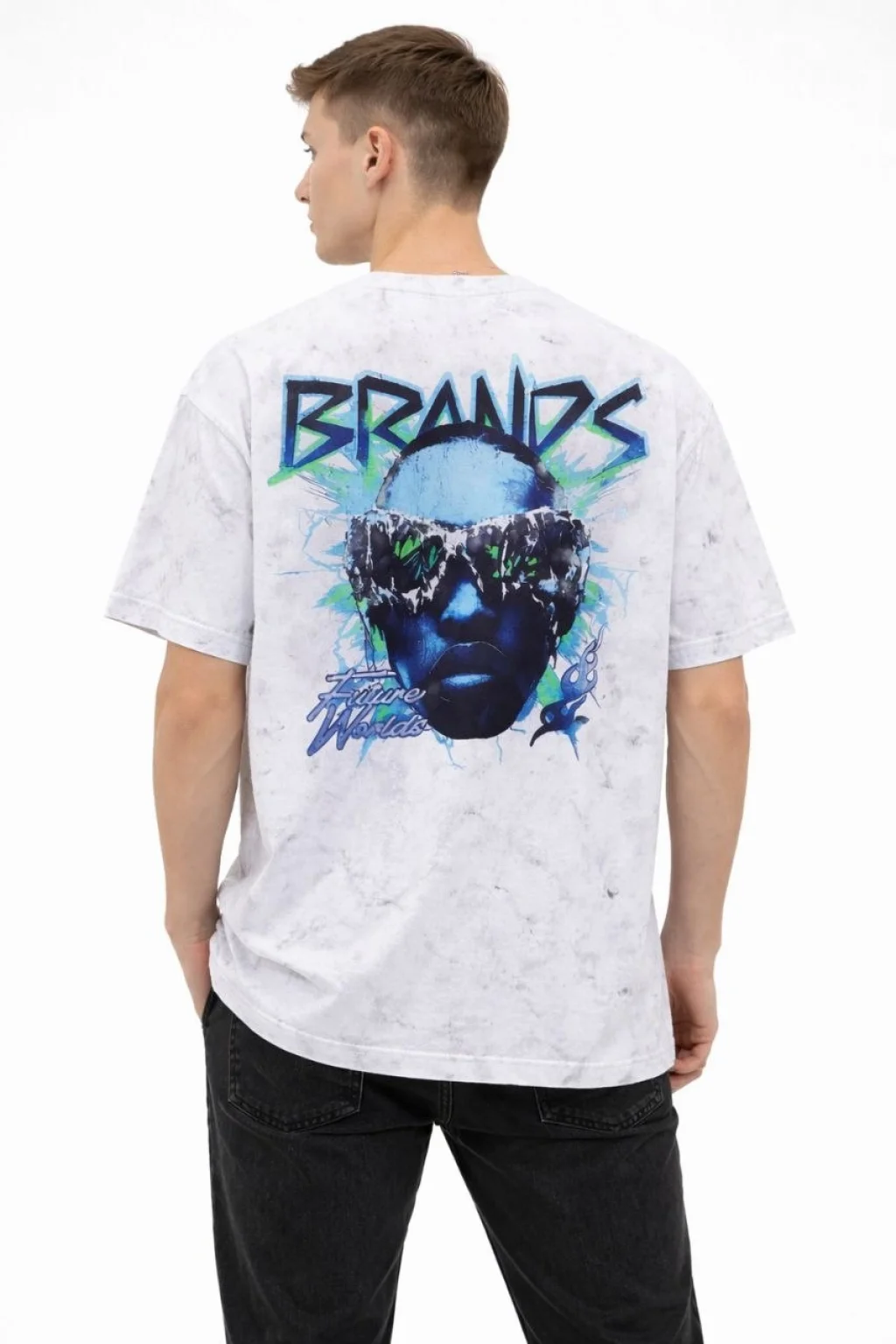 Erkek Asit Yıkamalı Oversize Tişört Future Worlds Baskılı Bisiklet Yaka Kısa Kollu Streetwear %100 Pamuk Street Style T-Shirt - Beyaz