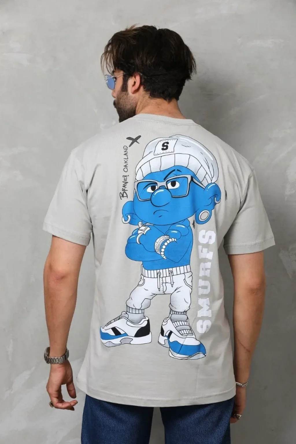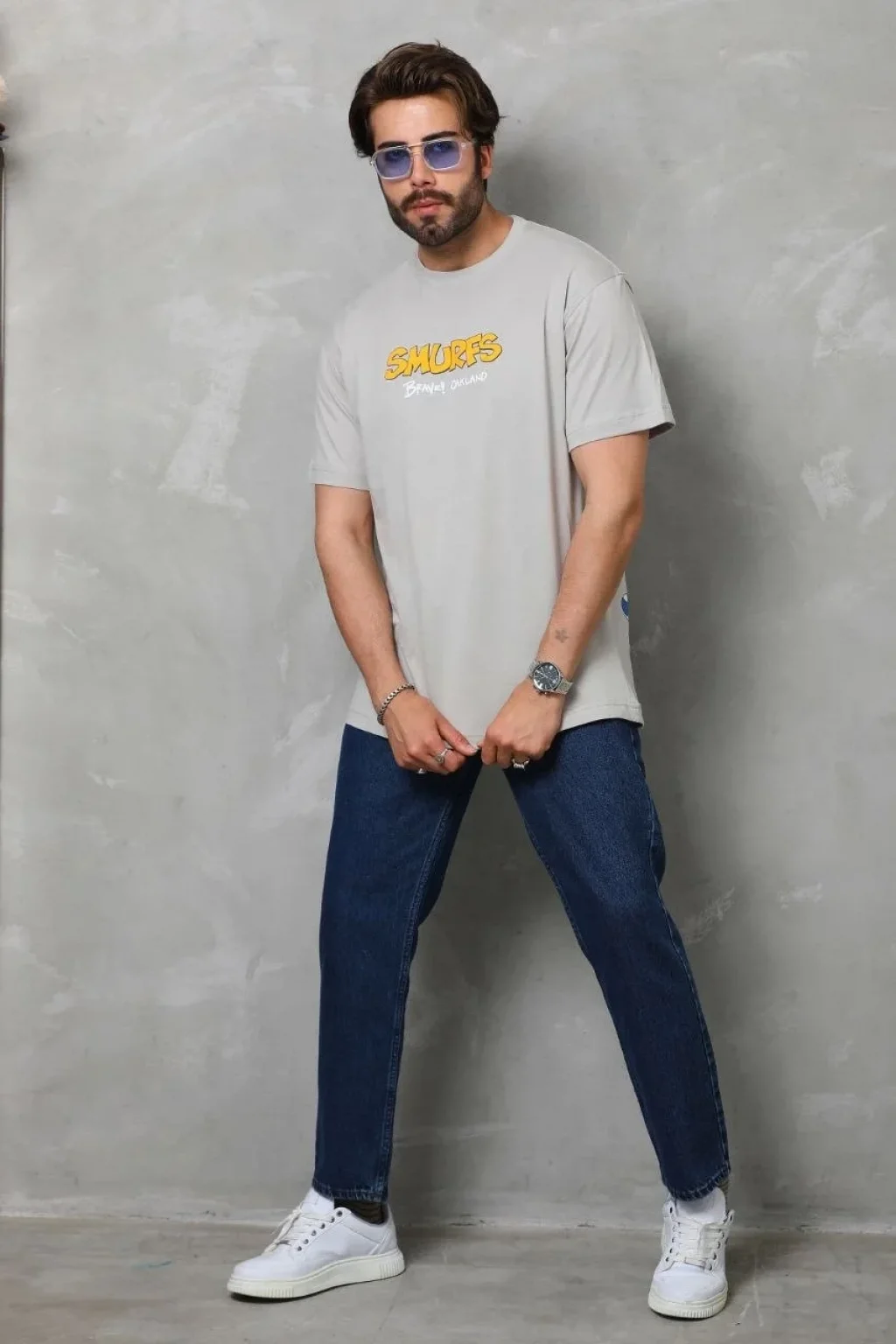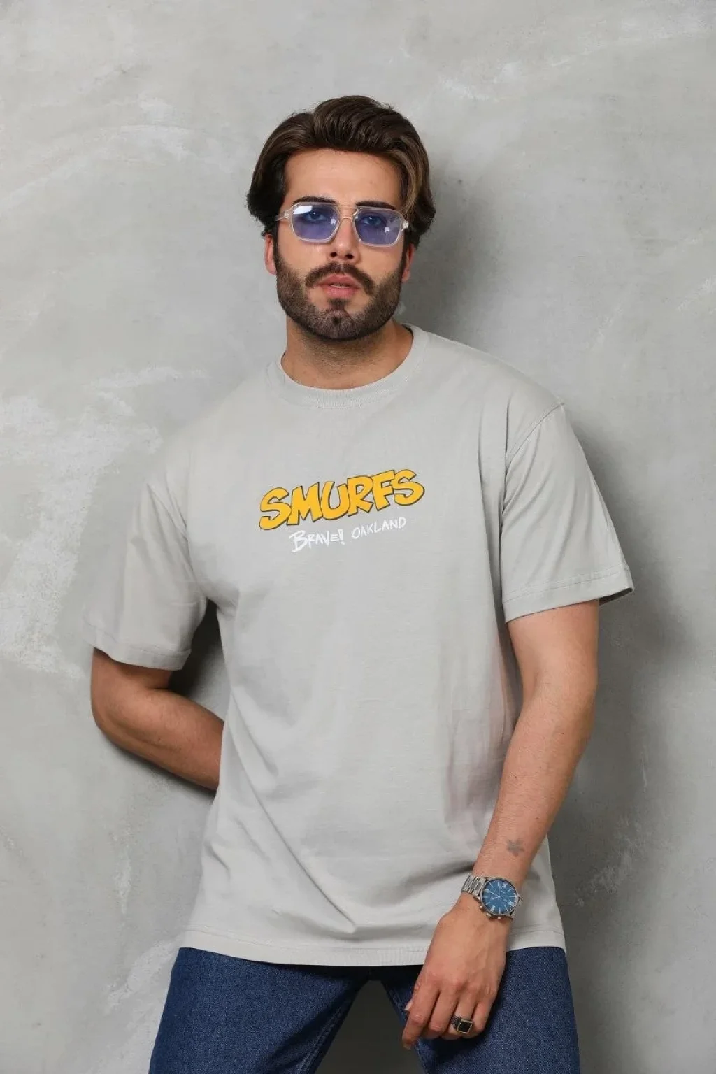 Erkek Kısa Kol Yazlık Tişört Bisiklet Yaka Baskılı Oversize T-Shirt - Gri