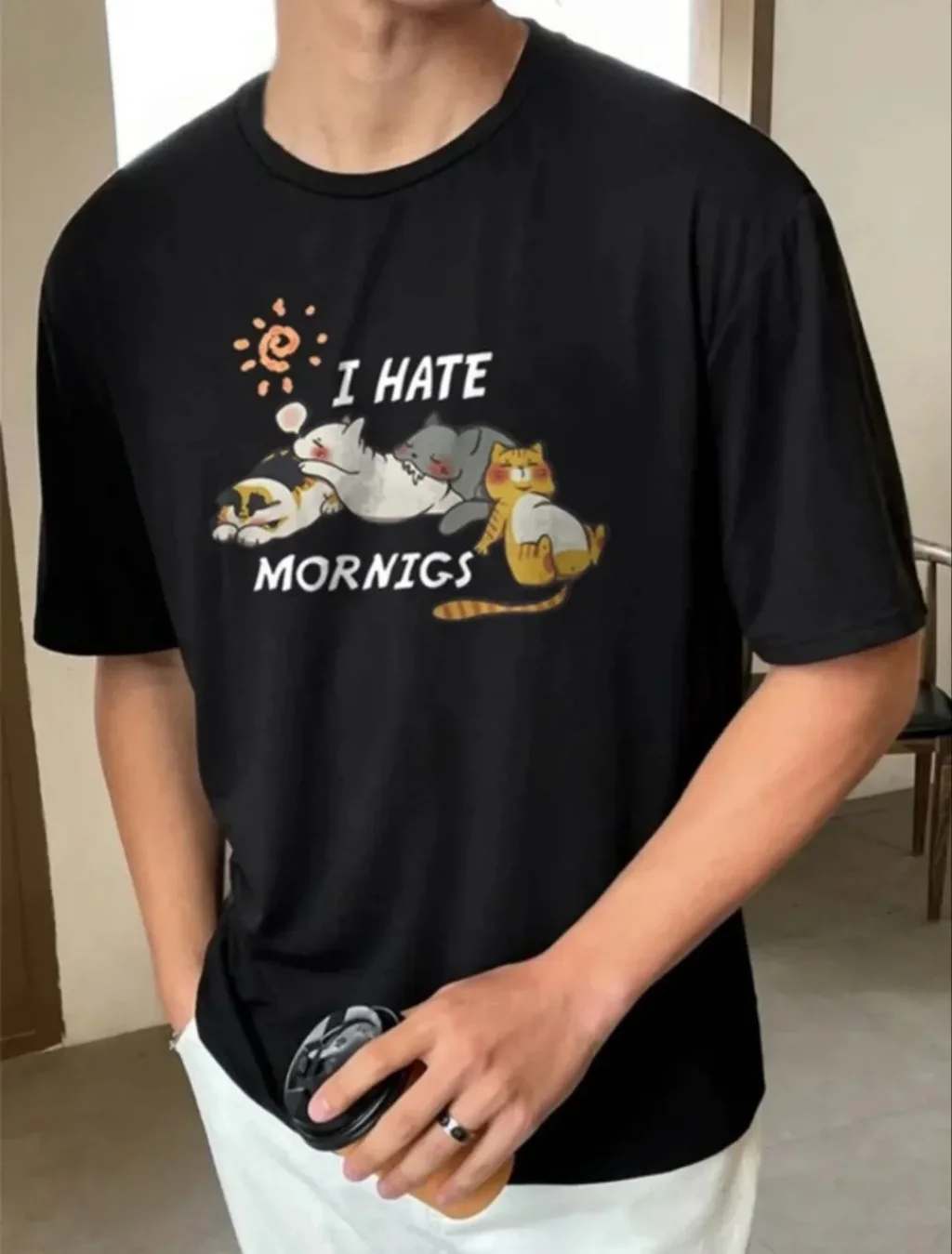 Erkek Asit Yıkamalı Baskılı Tişört Bisiklet Yaka Kısa Kollu Streetwear T-shirt - Siyah