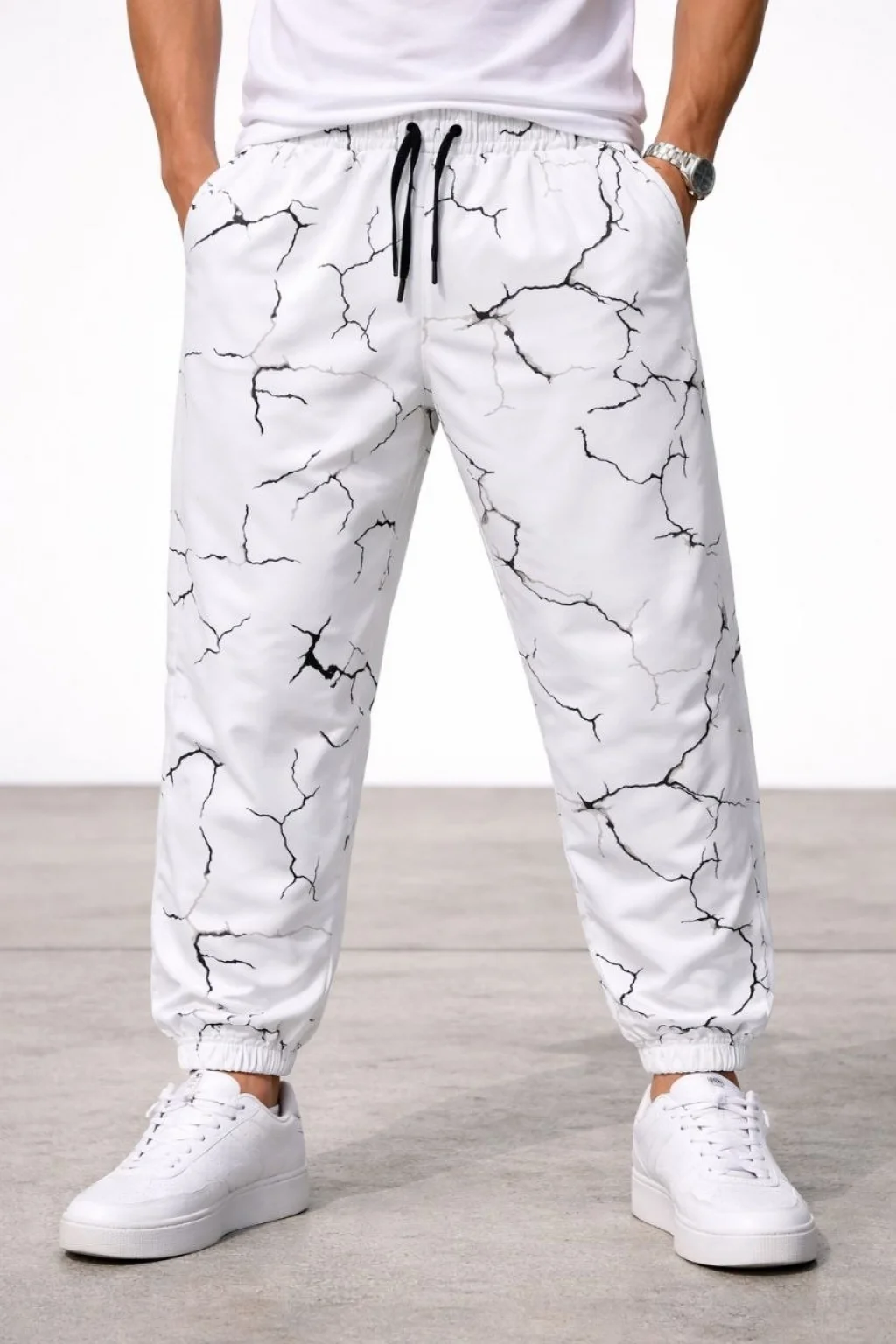 Erkek Dijital Baskılı Eşofman Altı Kışlık Üç İplik Şardonlu Kumaş Lastikli Paça, Cepli, Rahat Kalıp - Beyaz