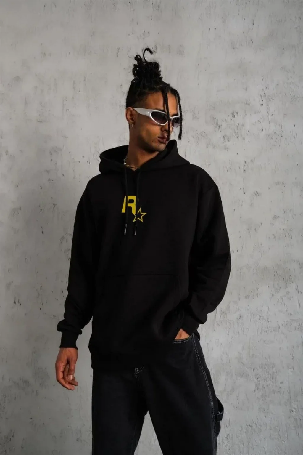 Erkek 3 İplik Pamuklu Kapüşonlu Baskılı Cepli Oversize Sweatshirt Hoodie - Siyah
