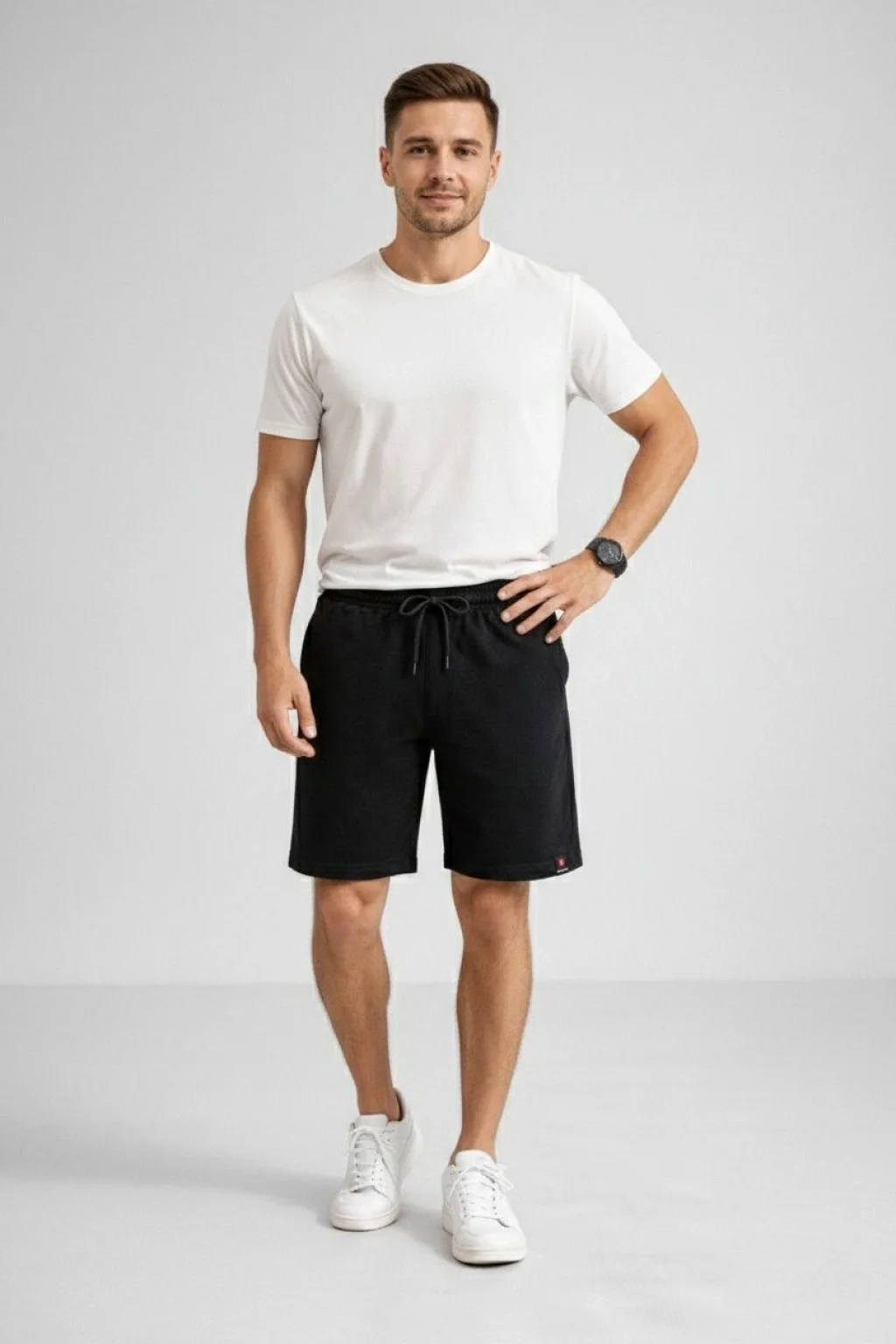 Erkek otoban Dokuma Şort Beli Lastikli Bağcıklı, Cepli, Rahat Kesim Günlük Yazlık Şort - Siyah