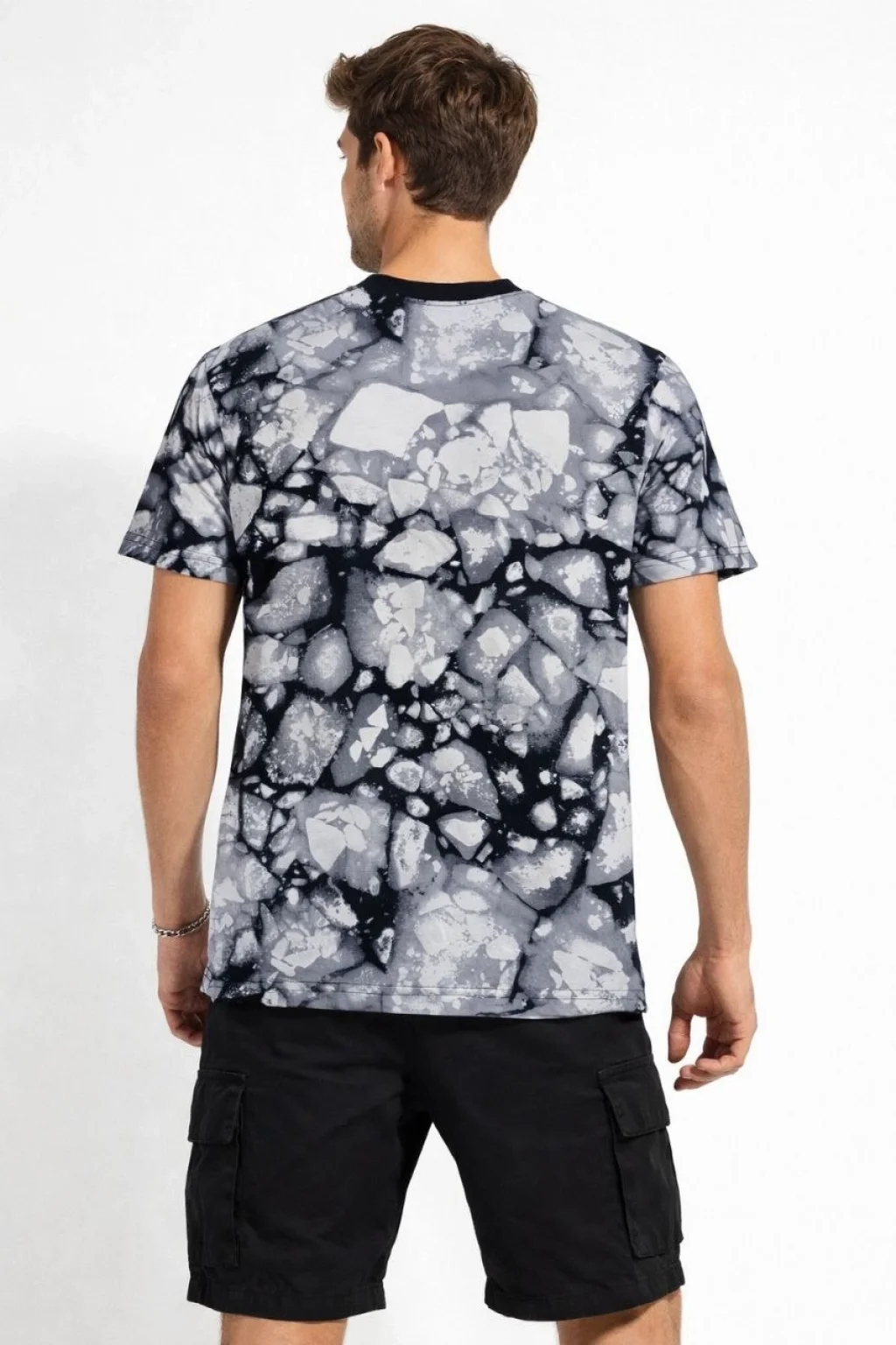 Erkek Siyah Gri Taş Desenli Tişört – Regular Fit, Bisiklet Yaka, Dijital Baskılı Modern Tasarım T-Shirt - Siyah
