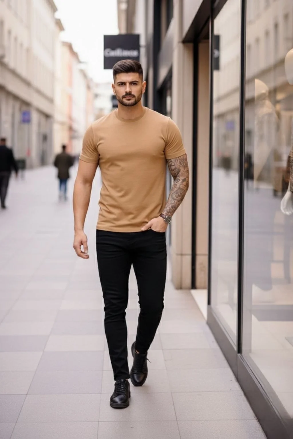 Erkek T-Shirt Bisiklet Yaka Slim Fit dar kesim Likralı Tişört Günlük Basic Body - Kahverengi
