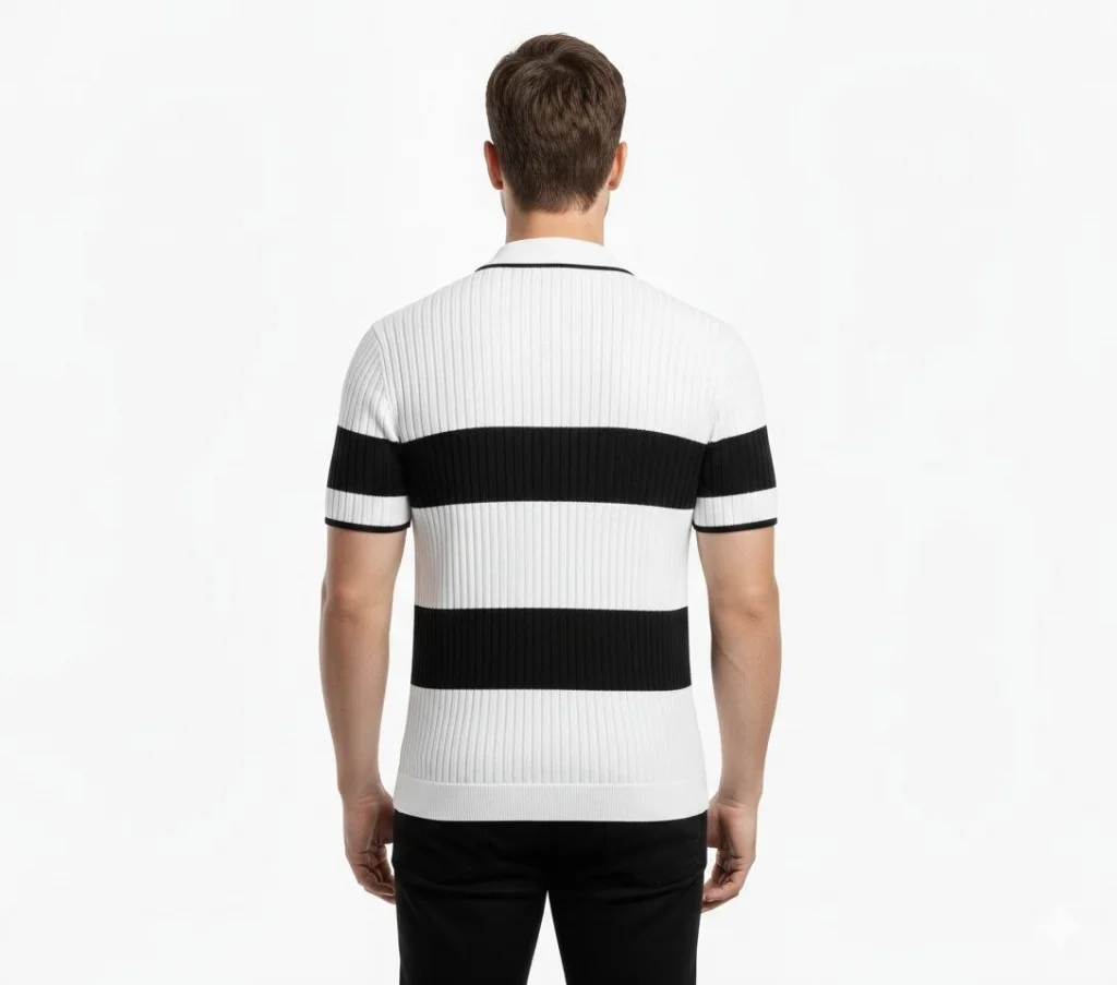 Erkek T-shirt Çizgili Triko Dokuma Kumaş Polo Yaka Yarım Fermuarlı Regular Kalıp Tişört - Beyaz