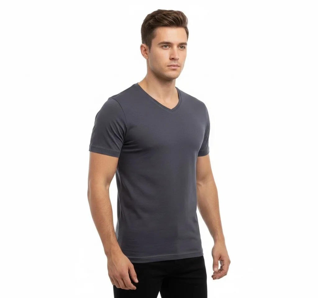 Erkek T-Shirt V Yaka Slim Fit dar kesim Likralı Tişört Günlük Basic Body - Füme