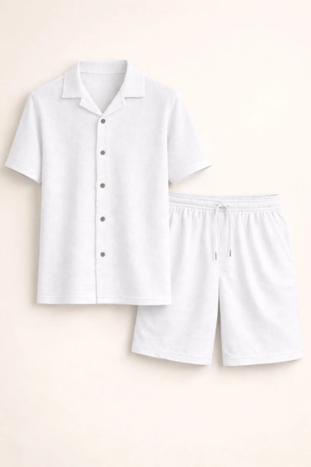 Erkek Waffle Kumaş Kısa Kollu Gömlek Şort Takım Regular Fit Yazlık İkili Set - Beyaz