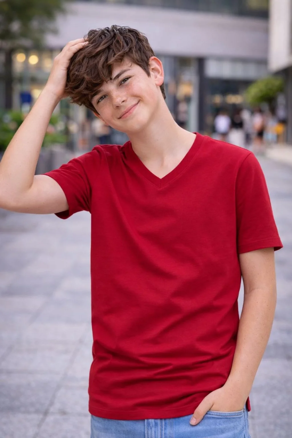 Genç Erkek Çocuk V Yaka Tişört Yazlık Model Günlük Basic Body - Bordo