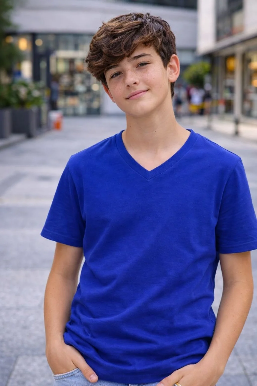 Genç Erkek Çocuk V Yaka Tişört Yazlık Model Günlük Basic Body - Saks Mavisi