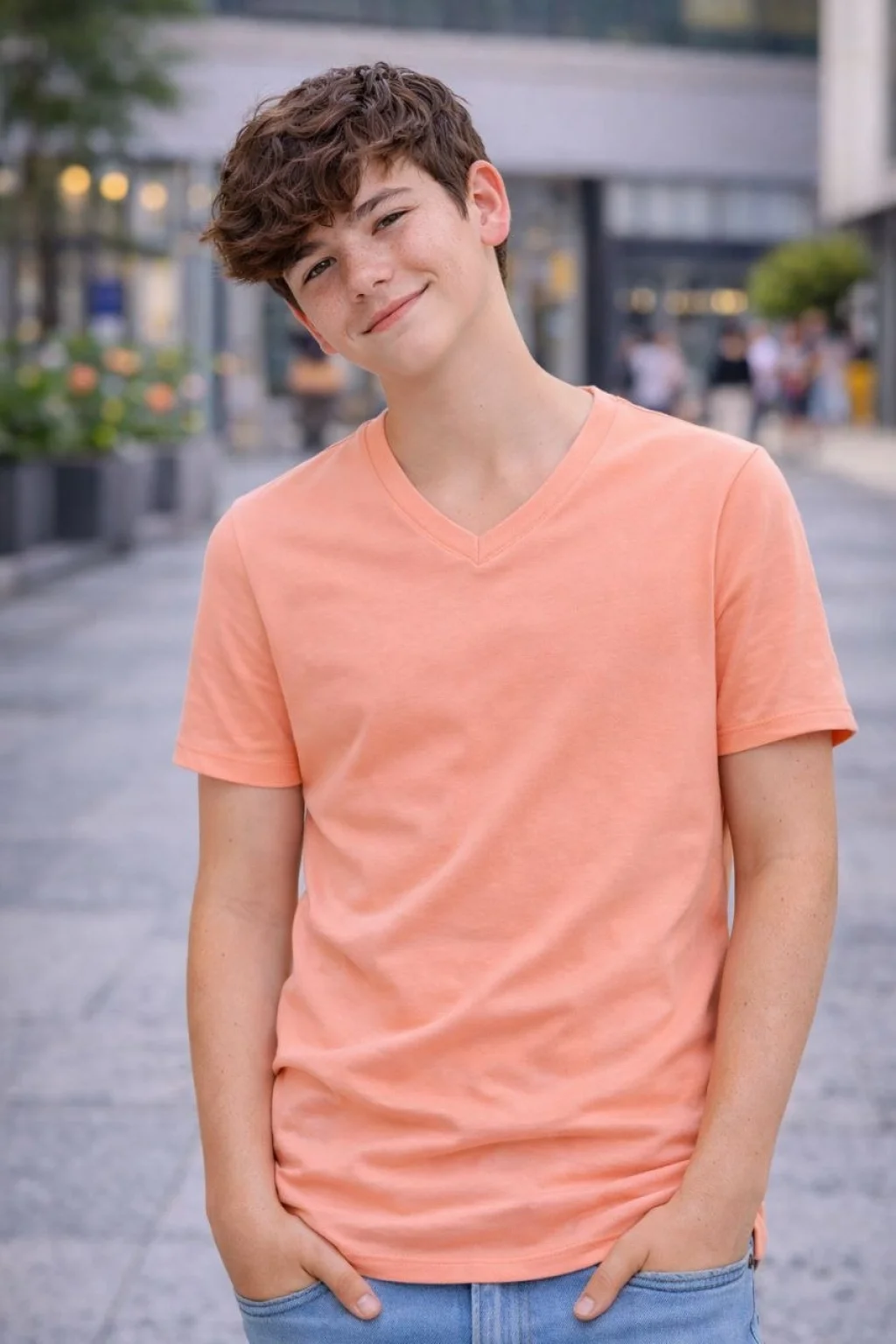 Genç Erkek Çocuk V Yaka Tişört Yazlık Model Günlük Basic Body - Toz Pembe