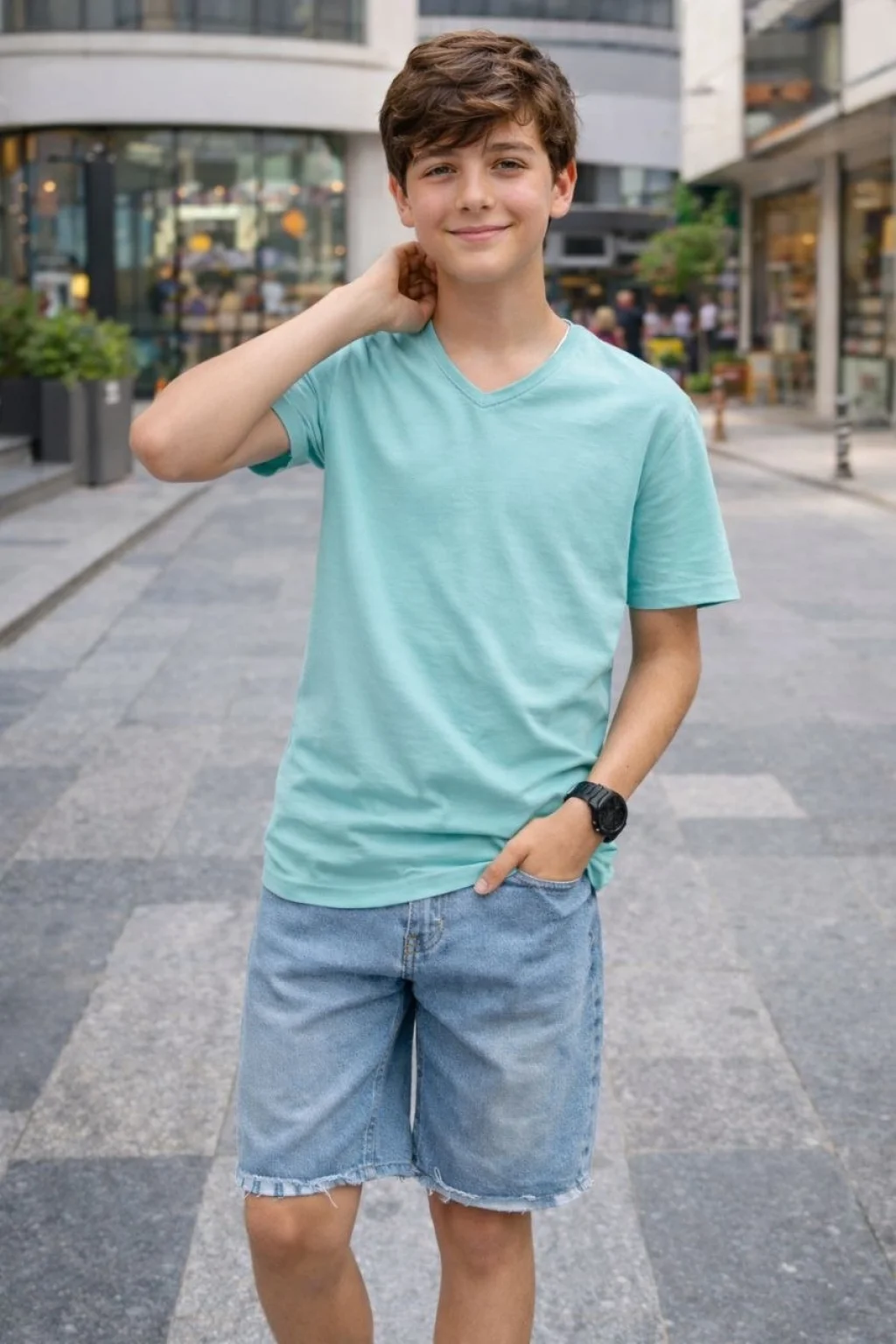 Genç Erkek Çocuk V Yaka Tişört Yazlık Model Günlük Basic Body - Turkuvaz