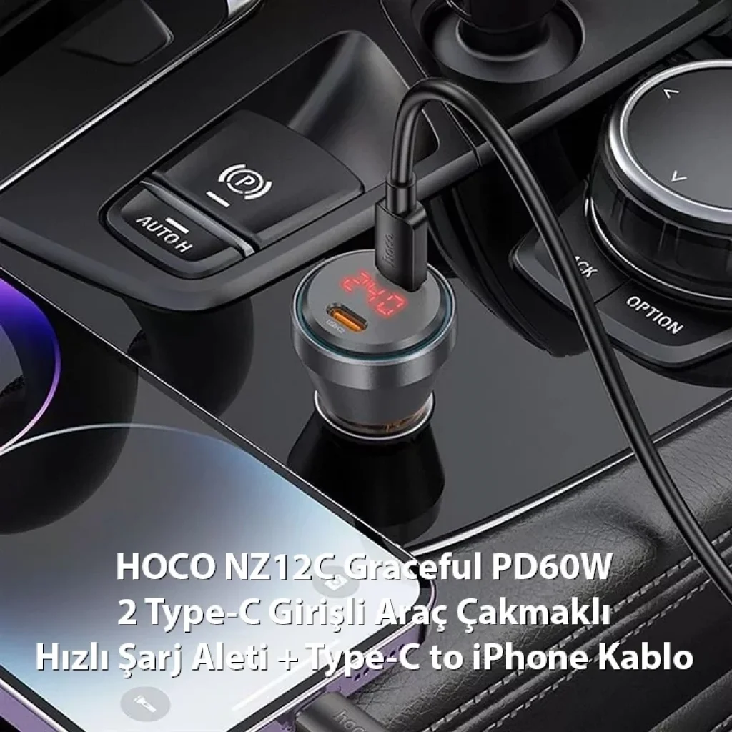 HOCO NZ12C Graceful PD60W 2 Type-C Girişli Araç Çakmaklı Hızlı Şarj Aleti + Type-C to iPhone Kablo-(5775)
