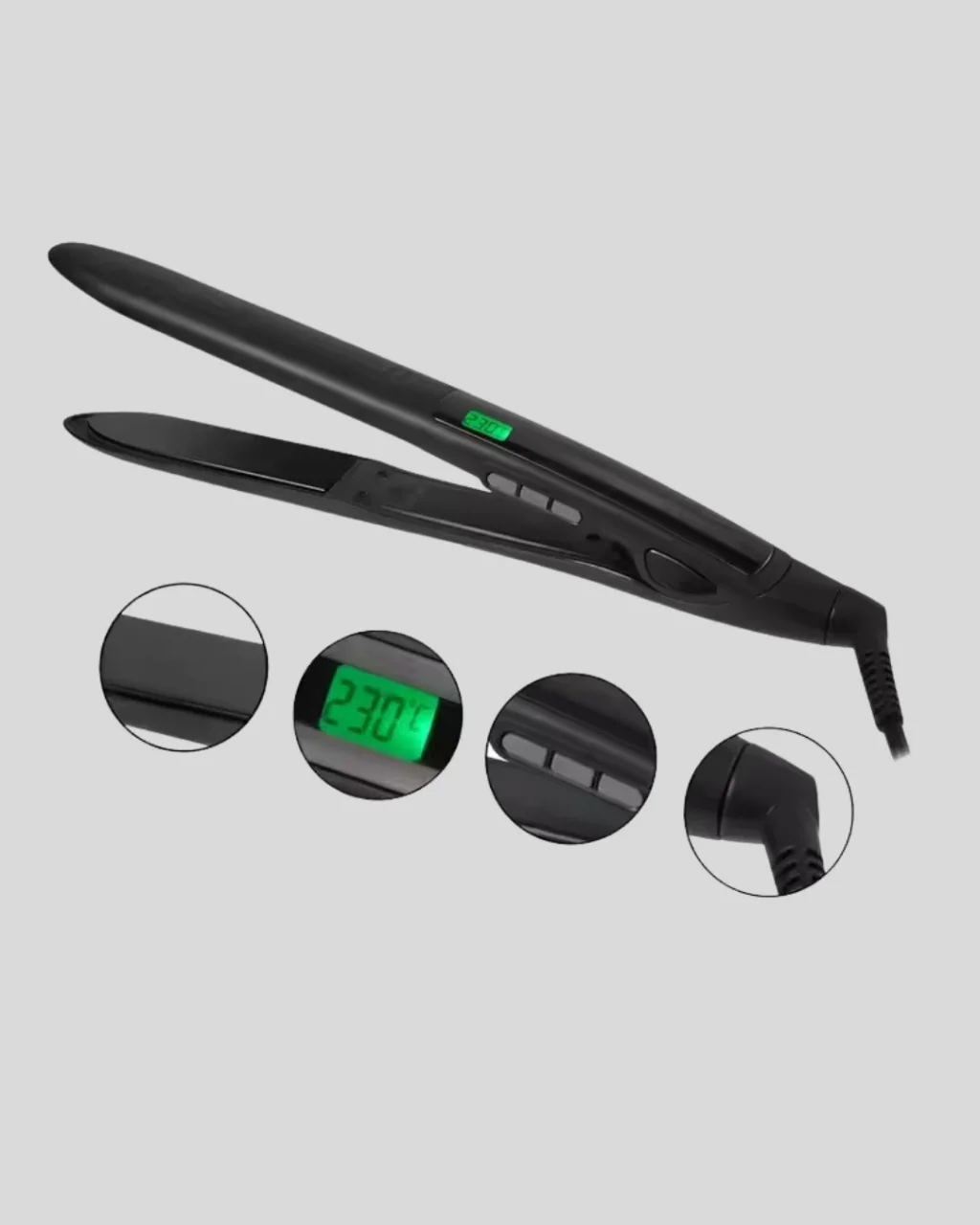 Evde profesyonel düzeyde saç şekillendirme deneyimi sunan Isı Ayarlı Saç Düzleştirici, üstün teknoloji ve yüksek ısı performansını bir araya getiriyor.Titanyum kaplı seramik plakalar, ısıyı eşit biçimde dağıtarak saçın zarar görmeden pürüzsüzleşmesini sağlar.176°C – 532°C arasında ayarlanabilir sıcaklık aralığı, her saç tipine uygun ısı seçeneği sunar.İnce telli saçlar için düşük, kalın ve kıvırcık saçlar için yüksek ısıyla mükemmel sonuçlar elde edebilirsiniz.Nem koruma sensörü, saçın doğal nem seviyesini algılayarak sıcaklığı otomatik şekilde ayarlar.Bu sayede saçın nem dengesi korunur, yıpranma riski azalır.360° dönebilen kablo ve 2.5 metre uzunluk, kullanım sırasında maksimum hareket özgürlüğü sunar.Kablo karışıklığına son vererek profesyonel kullanım kolaylığı sağlar.Dijital ekranı, sıcaklık kontrolünü net biçimde gösterir ve hassas ayar yapmanızı kolaylaştırır.Ergonomik tasarımı, elinizi yormadan uzun süreli kullanım imkânı tanır.Güvenlik kilidi, taşıma sırasında cihazın korunmasını sağlar.Seyahat dostu kompakt yapısı ile her an yanınızda.Isı Ayarlı Saç Düzleştirici, hem profesyonellerin hem de evde bakımına özen gösterenlerin favorisi olacak.