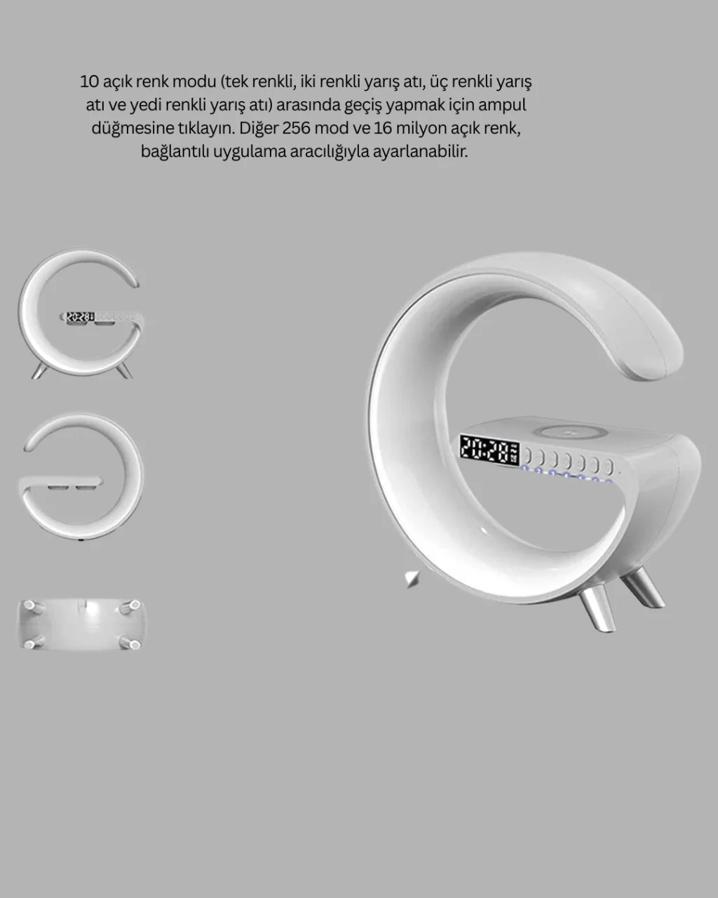 Bu çok fonksiyonlu akıllı atmosfer lambası, modern yaşam alanları için hem dekoratif hem de son derece kullanışlı bir üründür. 15W kablosuz hızlı şarj özelliği sayesinde telefonunuzu kısa sürede ve kablo karmaşası olmadan şarj edebilirsiniz. Yatak odası, başucu, çalışma masası, oturma odası ve ofis gibi alanlarda günlük kullanım için idealdir.Ürün; kablosuz şarj cihazı, Bluetooth hoparlör, masa lambası, uyku lambası, alarm saati ve saat özelliklerini tek bir gövdede birleştirir. Bluetooth bağlantı sayesinde müzik dinleyebilir, kitap okurken ya da dinlenirken yumuşak ışık eşliğinde keyifli bir ortam oluşturabilirsiniz.