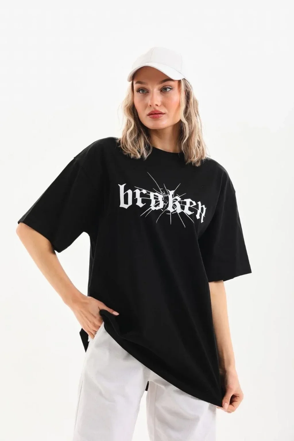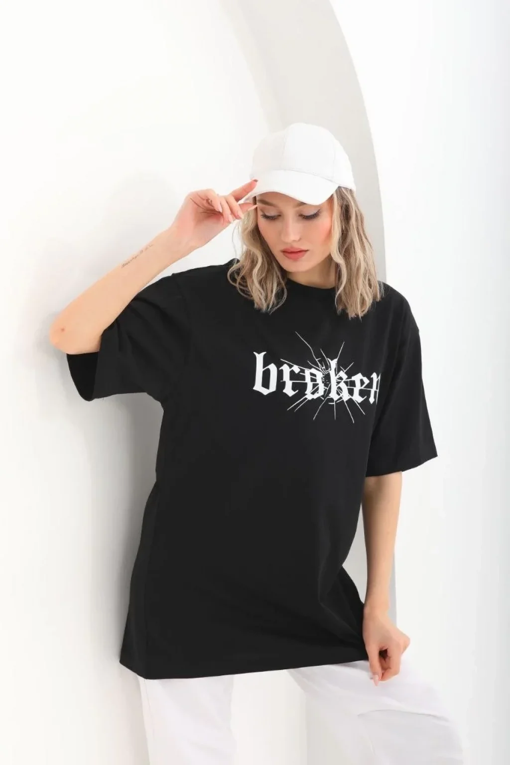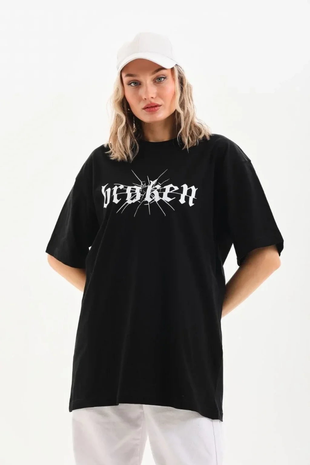 Kadın Kısa Kol Yazlık Tişört Bisiklet Yaka Baskılı Oversize T-Shirt - Beyaz