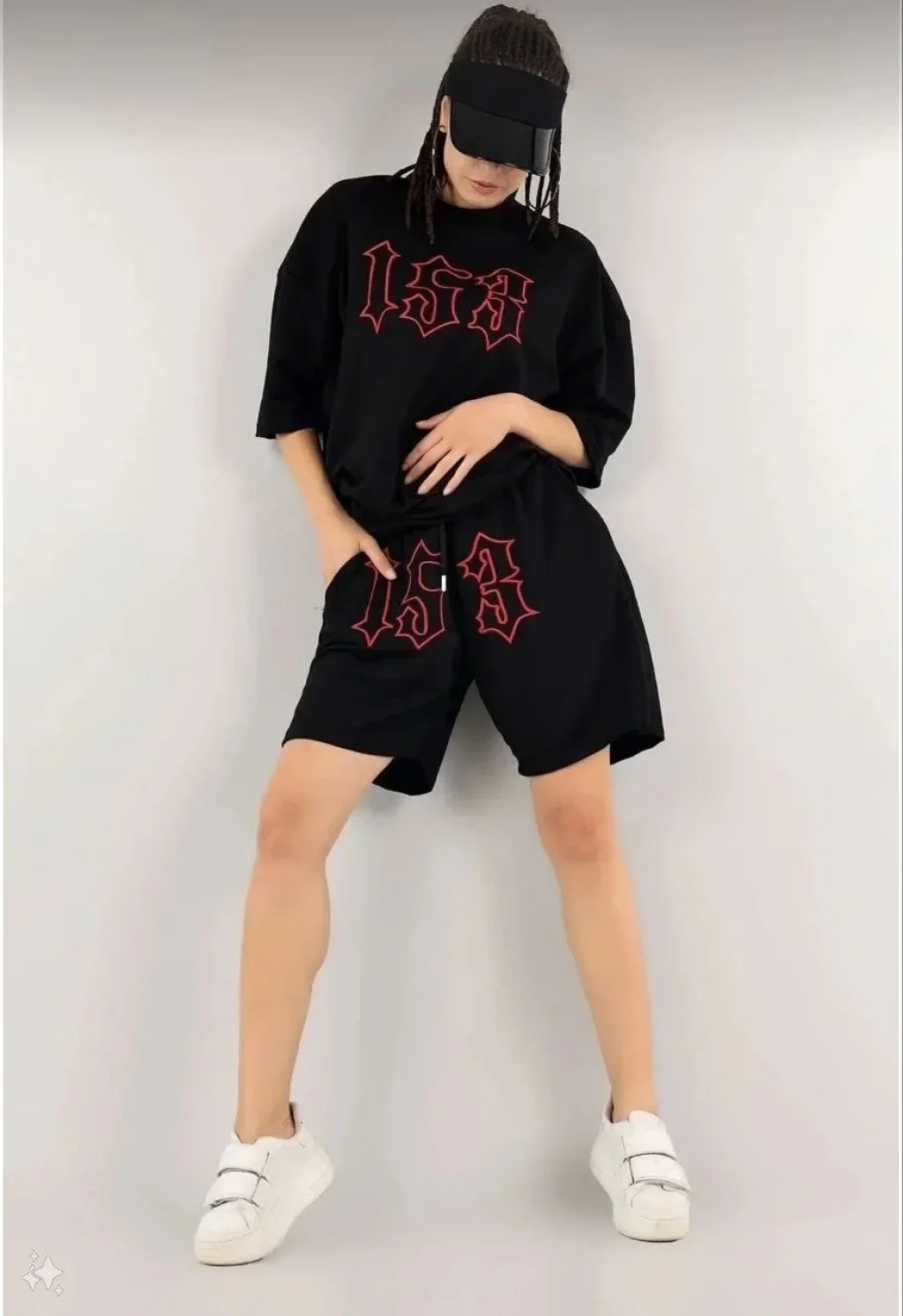Kadın Nakış İşlemeli Şort Kısa kol Alt-Üst Takım - Siyah