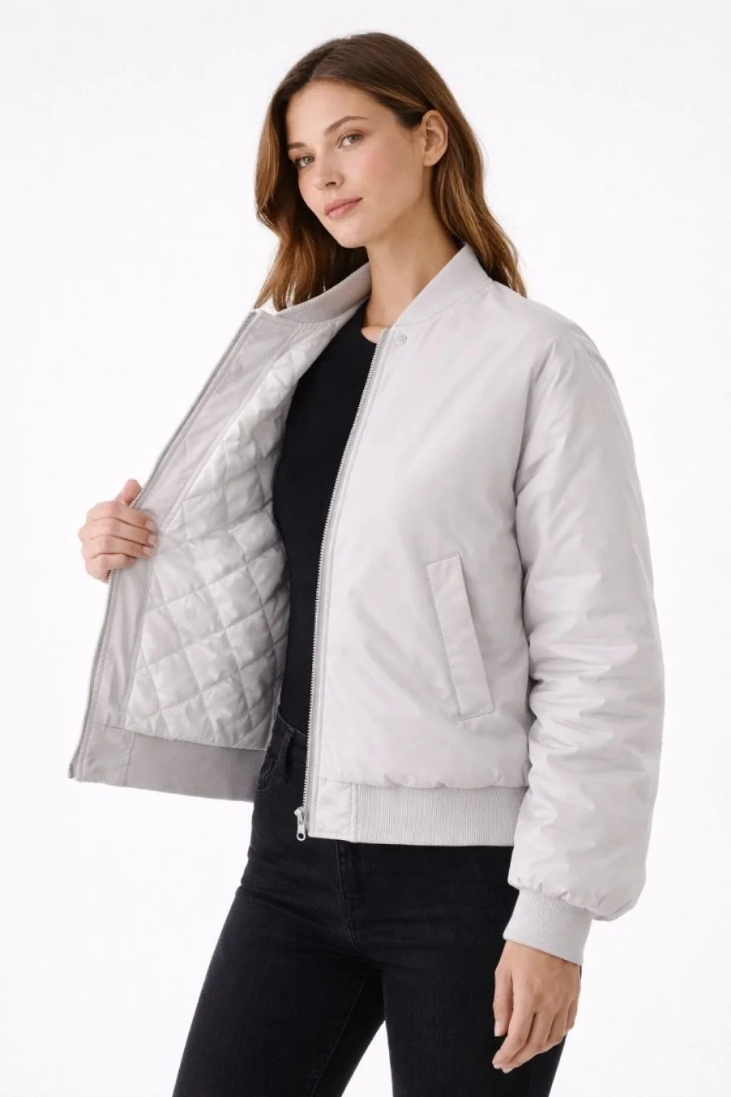 Kadın Premium Bomber Ceket Çıtçıt Kapamalı, Ribana Manşetli, Astarlı, Regular Fit Mont - Beyaz