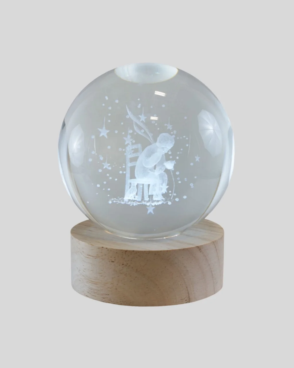 8 cm büyük boy cam küre, dekoratif boyutuyla bulunduğu ortamda güçlü bir görsel etki yaratır. Üst kısmı tamamen camdan üretilmiş olup ışığı yumuşak şekilde dağıtır. Alt kısmı ahşap malzemeden üretildiği için doğal bir görünüm sunar. Küçük Prens temalı tasarımı, özellikle modern, minimal ve nostaljik dekorasyon tarzlarıyla çok iyi uyum sağlar. Gece lambası olarak da kullanılabilir.