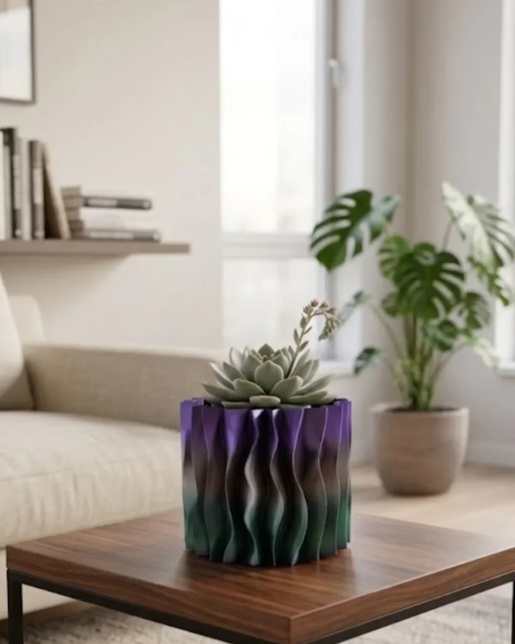 Modern Dalgalı Yüzey Tasarımlı Mor 3D Dekoratif Saksı Vazo
