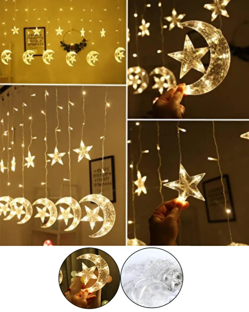 Bu dekoratif hilal ve yıldız perde aydınlatma sistemi, Ramazan, bayram, düğün, nişan, doğum günü ve parti organizasyonları için ideal bir süsleme çözümüdür. Mekâna kattığı sıcak sarı ışık tonu sayesinde hem samimi hem de zarif bir atmosfer oluşturur.İki farklı ışık modu sayesinde ortamın konseptine uygun bir görünüm elde edebilirsiniz. Sabit ışık modu daha klasik ve şık bir ambiyans yaratırken, yanıp sönen mod eğlenceli ve dikkat çekici bir etki oluşturur. Bu özellik, ürünü çok yönlü bir dekorasyon ürünü haline getirir.Dayanıklı plastik figürler ve kaliteli PVC kablo tasarımı uzun ömürlü kullanım sağlar. Güvenli yapısı sayesinde iç mekân kullanımında rahatlıkla tercih edilebilir. Kablo yapısı korumalıdır ve güvenlik ön planda tutularak tasarlanmıştır.Perde önünde, arka plan dekoru olarak, masa arkası süslemede ya da vitrin tasarımında rahatlıkla kullanılabilir. Işık yandığında hilal ve yıldız figürleri daha belirgin hale gelir ve bulunduğu ortama estetik bir derinlik kazandırır.
