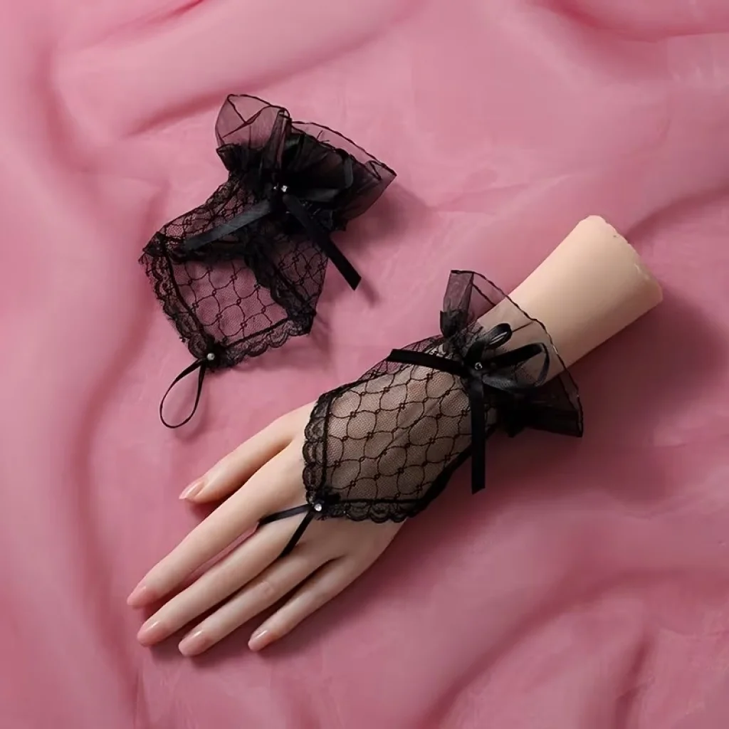 Siyah Dantel Fiyonklu Parmak Halkalı Kadın Eldiveni