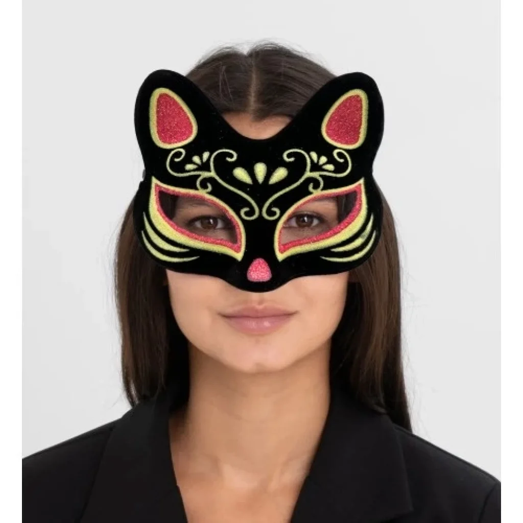 Siyah Süet Kırmızı Sarı Simli Kedi Maskesi
