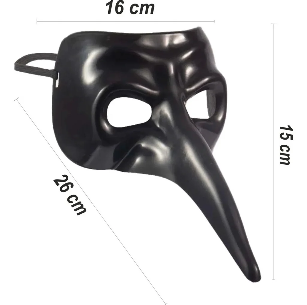 Siyah uzun burun tasarımıyla dikkat çeken veba doktoru maskesi, Venedik tarzı klasik maskelerden ilham alınarak üretilmiştir. Gizemli ve dikkat çekici görünümü sayesinde parti, eğlence, kostüm ve sahne etkinliklerinde kullanılabilecek ideal bir aksesuardır.