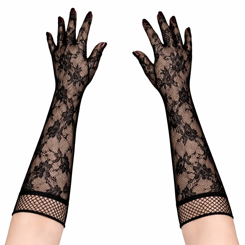 Siyah Uzun Gül Desenli Dantel Kadın Eldiveni