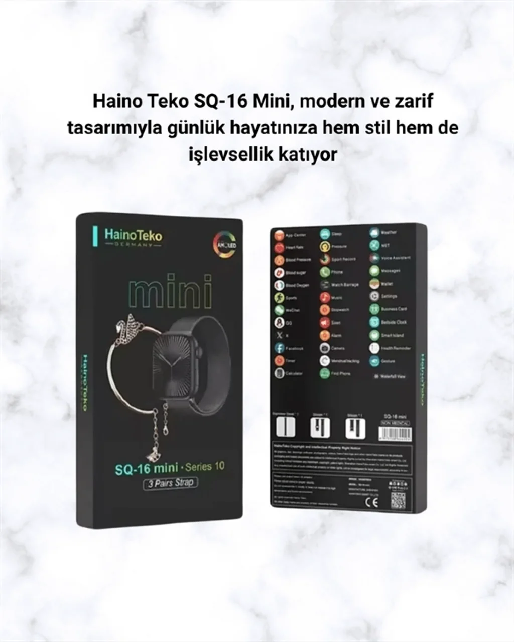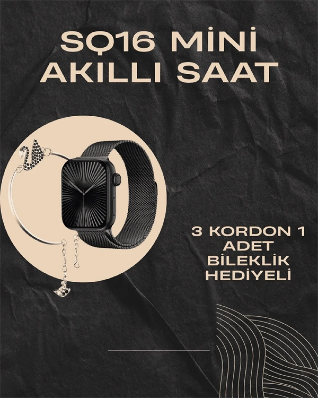 Giyilebilir teknolojide stil arayanlar için SQ-16 Mini Series 10 harika bir seçenek! Kutu içeriğinde bulunan silikon, metal ve deri olmak üzere 3 farklı kordon seçeneği ile her ortama ve kombine uyum sağlar. Ayrıca şık bir bileklik hediyesi ile tarzınızı tamamlayın. Hem kadın hem erkek kullanıcılar için uygun bir unisex akıllı saat modelidir.