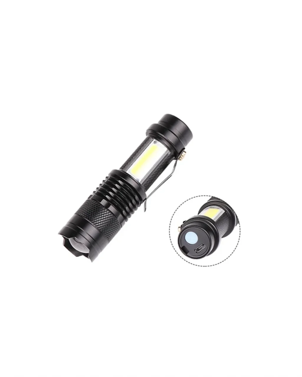 Bu kompakt LED el feneri, 2000 lümene kadar çıkabilen parlaklığı ile karanlık ortamlarda güçlü bir aydınlatma sağlar. Gövdesi alüminyum alaşımdan yapılmış olup suya ve kaymaya karşı dayanıklıdır. Dışbükey lens ile ışık odak mesafesi ihtiyaca göre ayarlanabilir. 4 ışık modu (yüksek, düşük, strobe, COB) arka düğme üzerinden kontrol edilir. 14500 şarj edilebilir pil dahildir. Klips sayesinde kemer veya çantaya sabitlenebilir. Kamp, avcılık, bisiklet, tırmanış gibi aktivitelerde rahatlıkla kullanılabilir. Uzun süre kullanılmayacaksa pil çıkarılmalıdır. Göz ile doğrudan temastan kaçınılmalıdır.
