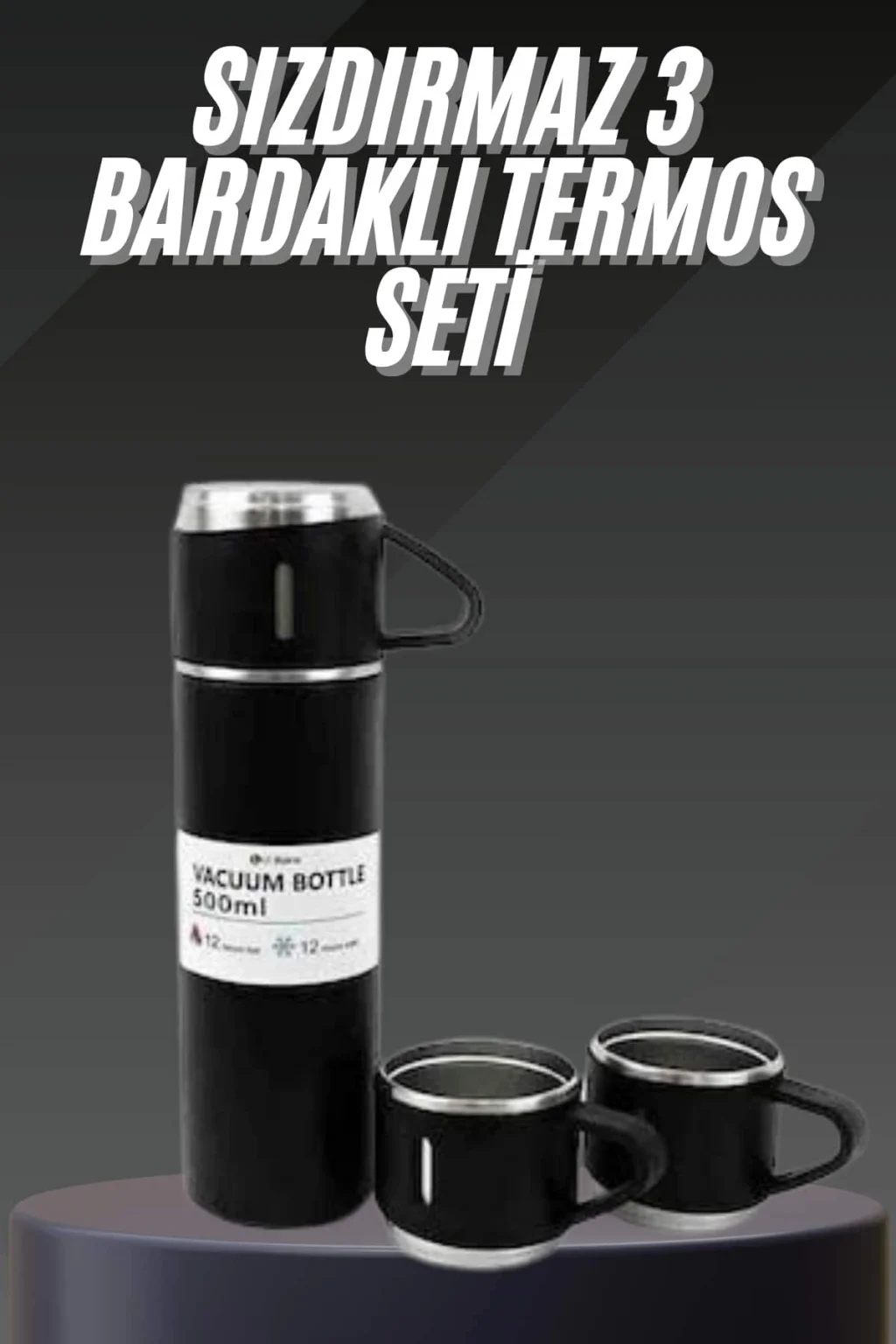 Termos Seti Paslanmaz Çelik 3 Bardaklı Vakumlu Termos Set 500 Ml 12 Saate Kadar Isı Koruma