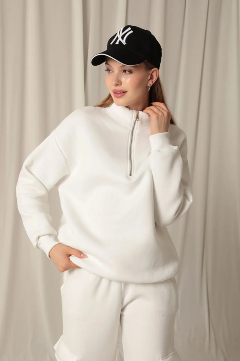 Üç İplik Dik Yaka Yarım Fermuarlı Kadın Ekru Sweat