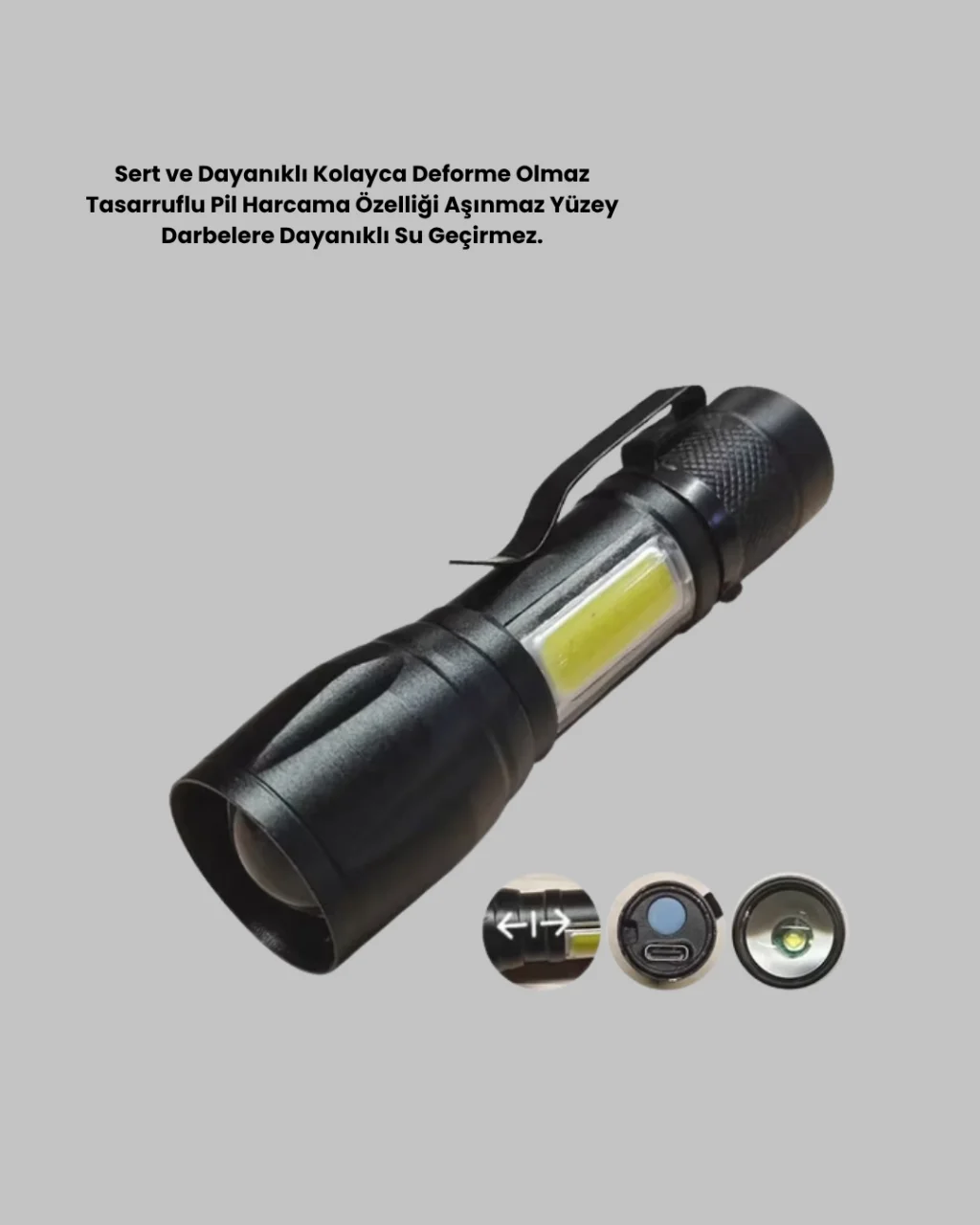 Profesyonel kullanım için geliştirilen 4 Modlu Şarjlı El Feneri, güçlü aydınlatma performansı, sağlam yapısı ve uzun ömürlü bataryasıyla dikkat çekiyor. Alüminyum alaşımlı metal gövdesi, darbeye ve çizilmelere karşı son derece dayanıklıdır. Bu sayede hem dış mekan aktivitelerinde hem de evde veya iş yerinde güvenle kullanılabilir.Ürün, 4 farklı ışık modu sunar: yüksek, orta, düşük ve SOS (selektör) modu. Her ortam için uygun bir aydınlatma seçeneği mevcuttur. SOS modu, acil durumlarda hayat kurtarıcı olabilir; örneğin kamp alanında kaybolduğunuzda veya araç arızası yaşadığınızda fark edilmenizi sağlar.İçerisinde bulunan Cree LED çipi, güçlü ve geniş açılı ışık sağlar. 100.000 saatlik LED ömrü ile uzun yıllar boyunca parlak performansını korur. LC 14500 1300 mAh şarjlı pili sayesinde kablo derdine son verir; pil kolayca şarj edilebilir ve uzun süreli kullanım sunar.Su geçirmez gövde yapısı sayesinde yağmurlu havalarda veya kamp ortamında rahatlıkla kullanılabilir. Ayrıca enerji tasarruflu yapısı, daha az pil tüketimiyle uzun süreli kullanım avantajı sağlar.Bu profesyonel el feneri, kampçılar, güvenlik personeli, avcılar, dağcılar ve ev kullanıcıları için ideal bir çözümdür. Kompakt, güçlü, dayanıklı ve uzun ömürlü – ihtiyacınız olan tüm özellikler tek bir üründe buluşuyor!